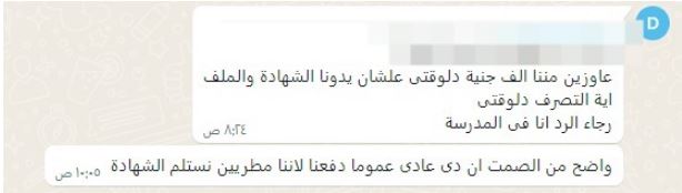 وقالت إحدى أولياء أمور طلاب الثانوية العامة في سوهاج، عبر جروب "حوار مجتمعي تربوي" والذي يجمع أولياء الأمور بقيادة الوزارة وعلى رأسهم رضا حجازي، وزير التعليم، أن مدرسة ابنها فرضت عليهم 1000 جنيه مقابل الحصول على ملفه وشهادته بالثانوية، لبدء إجراءات التنسيق.