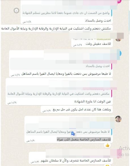 ليرد محمد البايلي قائلًا: "مكنتش دفعتم وكنت اشتكيت في النيابة الإدارية والرقابة الإدارية ونيابة الأموال العامة"، إلا أنها ردت عليه بأنهم كانوا في حاجة للشهادة بشكل سريع ولذا استغاثت عبر الجروب إلا أنها لم تجد من ينجدها.