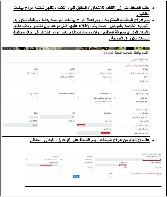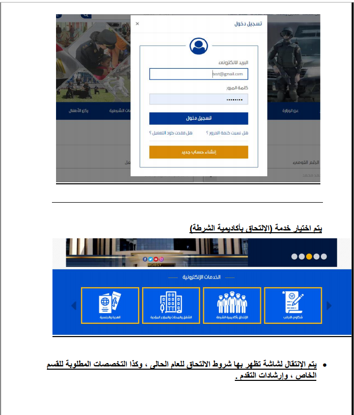9- الاختبار الهيئة ويخضع الطالب لاختبار تحريري في (دليل الطالب للمعاومات العامة) على الحاسب الآلي ثم المثول أمام اللجنة المشكلة للاختيار والتي تقوم بتطبيق معايير المفاضلة المنصوص عليها بقانون إنشاء أكاديمية الشرطة ولائحتها الداخلية بهدف انتقاء أفضل العناصر.