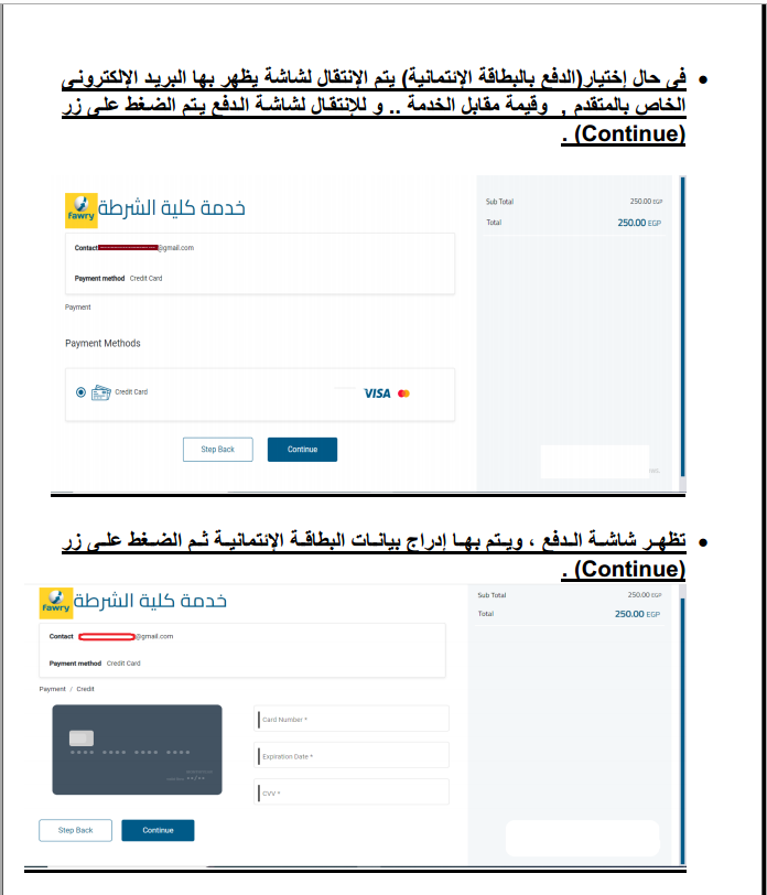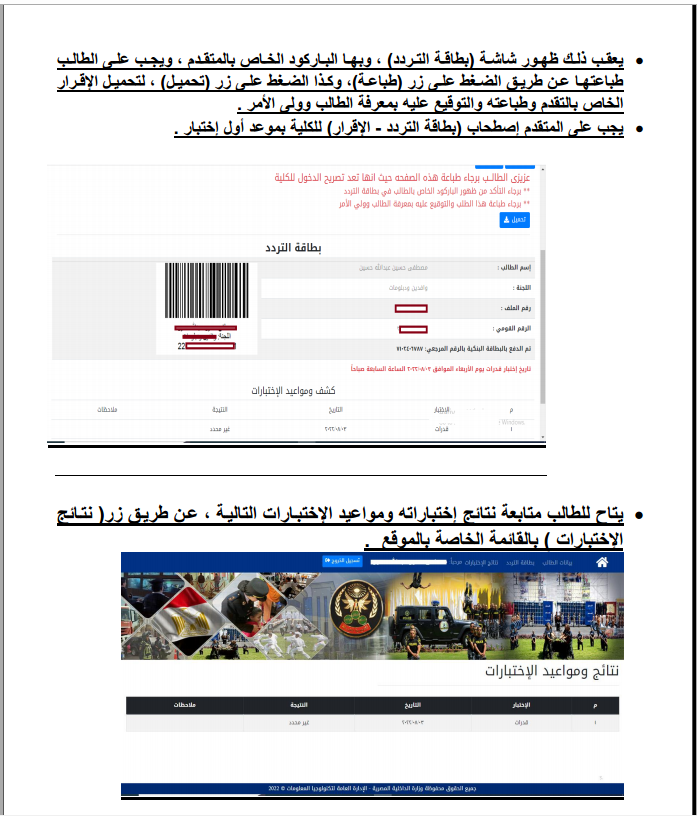 2- اختبار المقاس، طول قامة الطالب الحاصلين على الثانوية العامة "170 سم" وخريجي الجامعات "165 سم للطلبة - 160 سم للطالبات"، والطالب الذي لا يستوفي تلك الشُروط لا يكون له حق الإعادة.