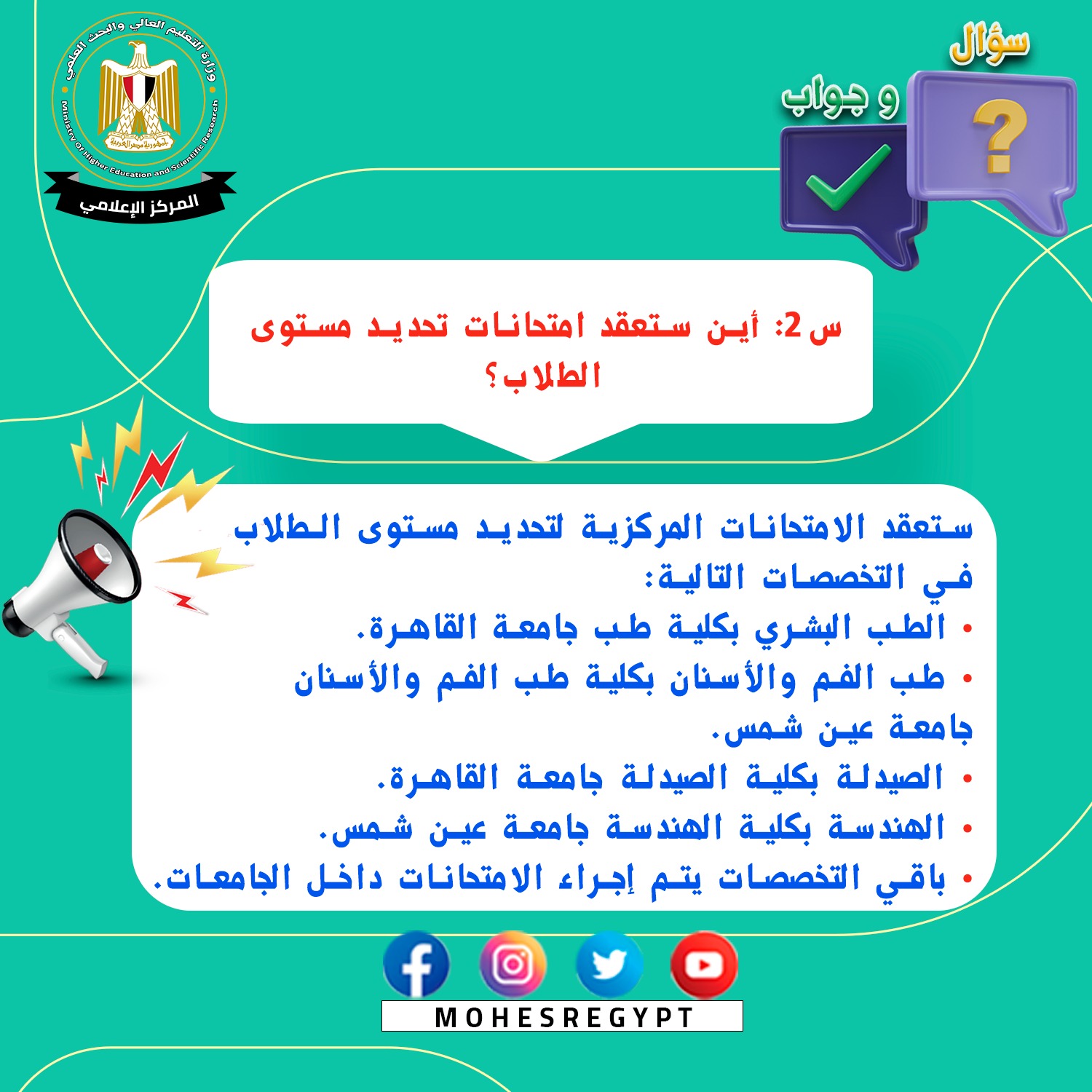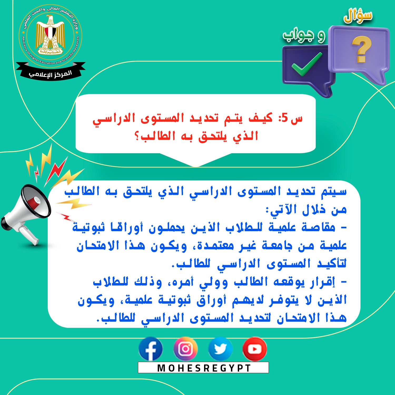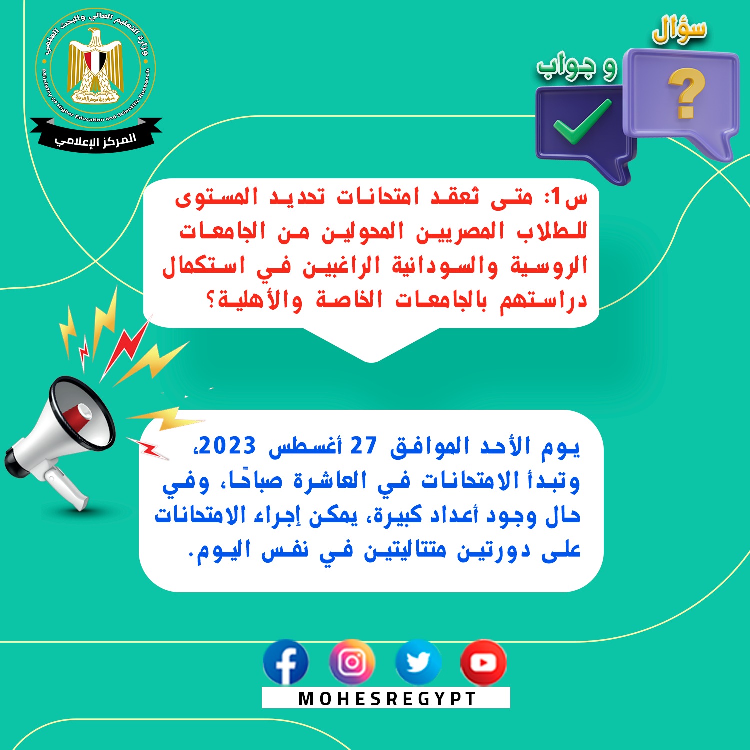 وصرح الدكتور عادل عبدالغفار المستشار الإعلامي والمتحدث الرسمي للوزارة، بأن الإدارة العامة للمكتب الإعلامي والمتحدث الرسمي للوزارة، كانت قد نشرت سابقا أدلة إرشادية تجيب على العديد من استفسارات وتساؤلات الطلاب في شكل (سؤال وجواب)، مشيرًا إلى أنه سيتم نشر دليل إرشادي جديد مع هذا البيان (سؤال وجواب) يتضمن الإجابة عن أبرز الأسئلة حول امتحان تحديد المستوى للطلاب.