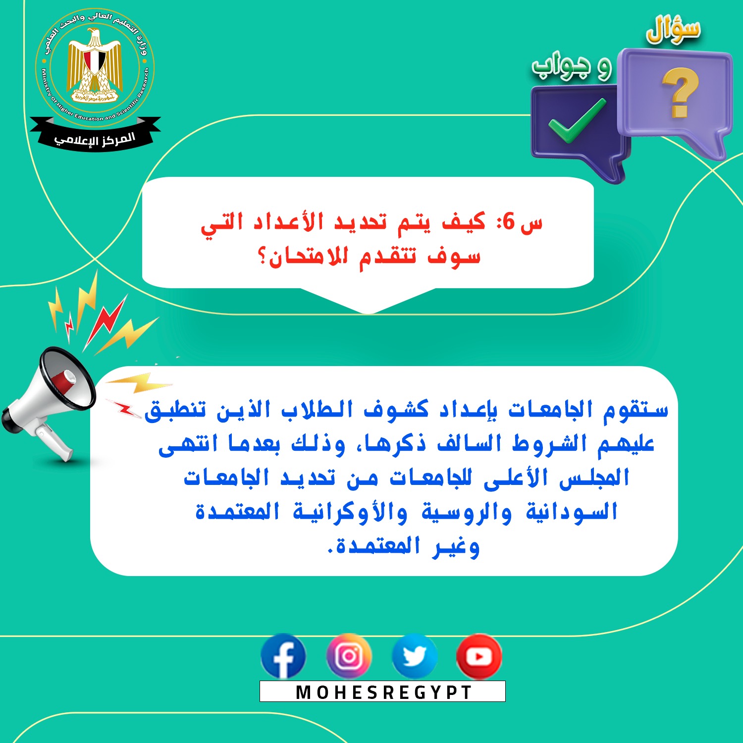 وفيما يتصل بكيفية تحديد الأعداد التي سوف تتقدم للامتحان، فإنه نظرًا للانتهاء من تحديد اعتماد الجامعات من قبل المجلس الأعلى للجامعات، فعلى الجامعات الخاصة والأهلية البدء في إعداد كشوف الطلاب الذين تنطبق عليهم الشروط السالف ذكرها بعاليه.