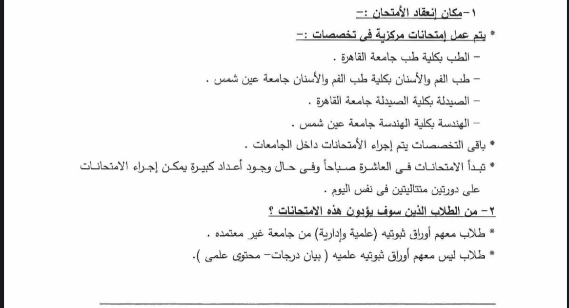 وتضمن القرار الصادر عن وزارة التعليم العالي والبحث العلمي، إجراء اختبار تحديد المستوى في تخصصات الطب، وتقام بكلية طب جامعة القاهرة، وطب الفم والأسنان، وتقام بكلية طب الفم والأسنان جامعة عين شمس، بينما الصيدلة تتم بكلية الصيدلة جامعة القاهرة، الهندسة بكلية الهندسة جامعة عن شمس، كما أن باقي التخصصات سيتم إجراء الامتحانات داخل الجامعات، حيث تبدأ الامتحانات في العاشرة صباحا وفي حال وجود أعداد كبيرة يمكن إجراء الامتحانات في دورتين متتاليتين في نفس اليوم.