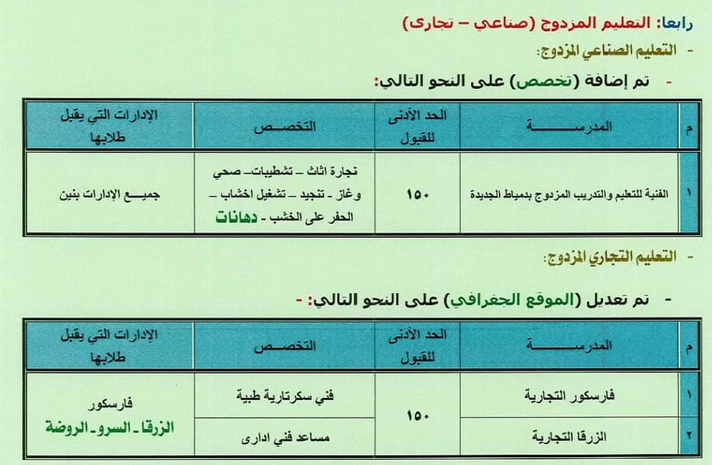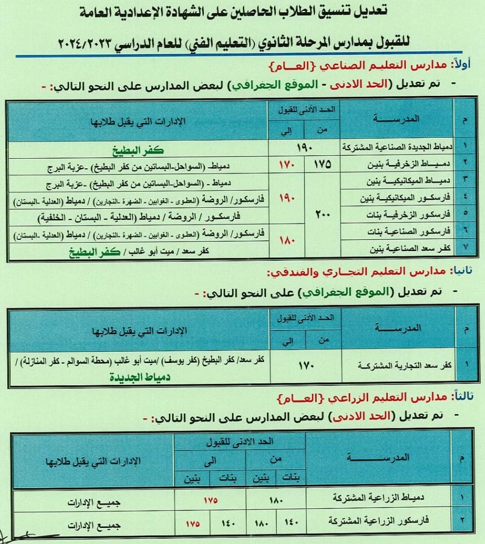 على جانب آخر، اعتمدت " المحافظ " تعديل تنسيق القبول ببعض مدارس المرحلة الثانوية للتعليم الفنى وفقًا لما هو محدد بالجداول الآتية: