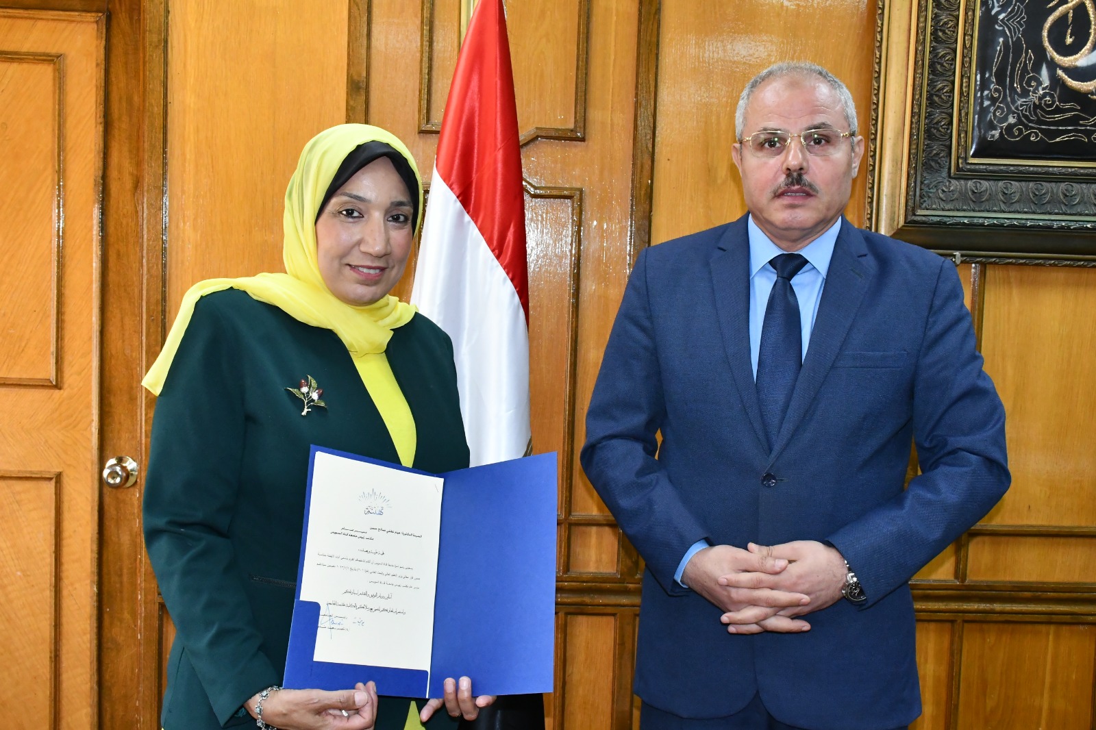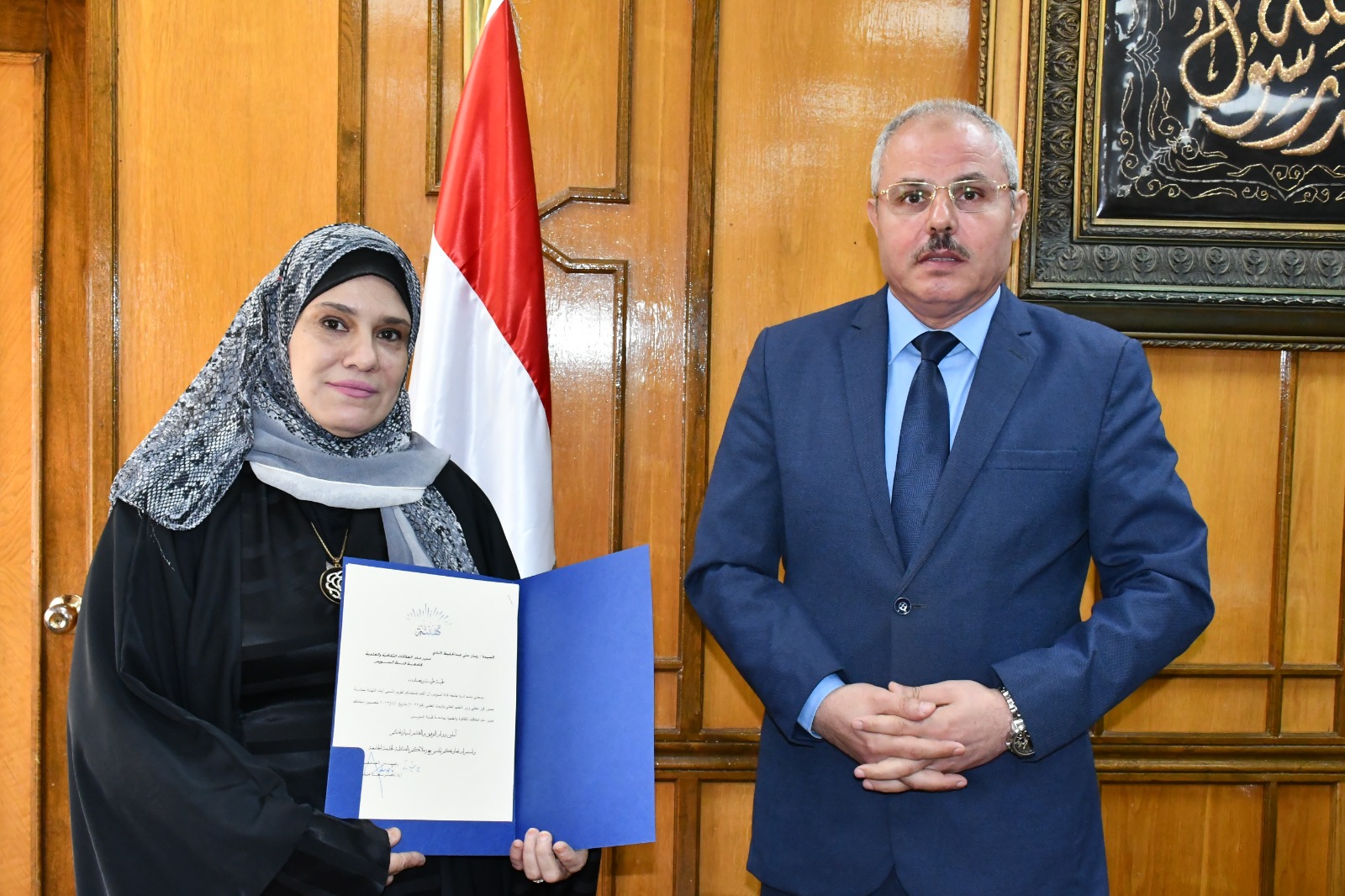هذا وقد استقبل الدكتور ناصر مندور رئيس جامعة قناة السويس "ريمان النادي" لتسليمها القرار، متمنيًا لها التوفيق والسداد.