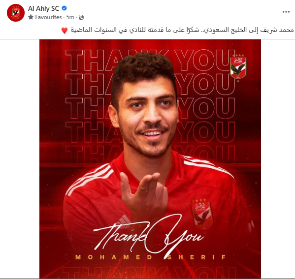 ونشرت الصفحة الرسمية للأهلي منشورا كتبت عليه: " محمد شريف إلى الخليج السعودي.. شكرًا على ما قدمته للنادي في السنوات الماضية".