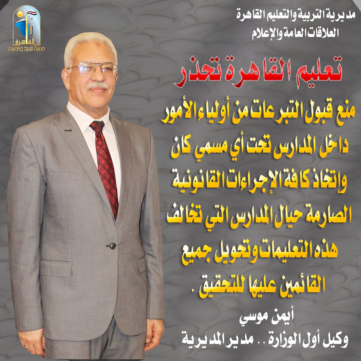 حذر أيمن موسى مدير مديرية التربية والتعليم بالقاهرة، مديرى المدارس من قبول أى تبرعات من أولياء الأمور داخل المدارس تحت أى مسمى، مؤكدا أنه سيتم إتخاذ كافة الإجراءات القانونية الصارمة حيال المدارس التى تخالف هذه التعليمات وتحويل جميع القائمين عليها للتحقيق.