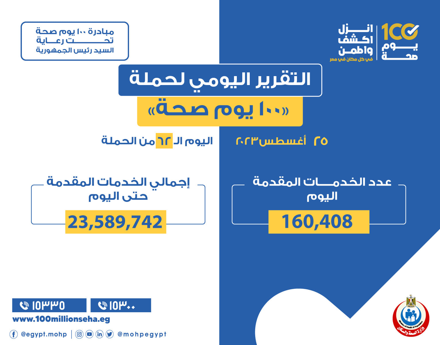 أعلن الدكتور خالد عبدالغفار وزير الصحة والسكان، تقديم 160 ألفا و408 خدمات، ضمن المبادرات الرئاسية وجميع التخصصات الطبية والعلاجية والوقائية وتنظيم الأسرة، من خلال حملة «100 يوم صحة» أمس الجمعة 25 أغسطس، في جميع محافظات الجمهورية.
