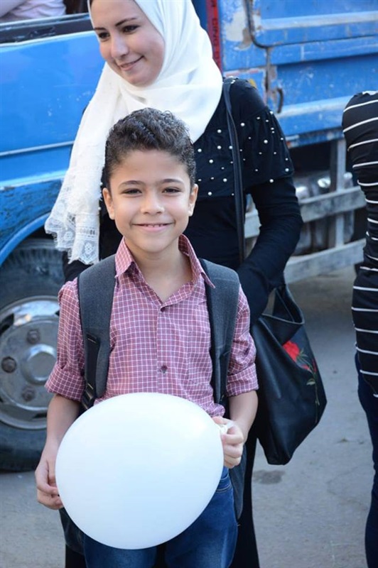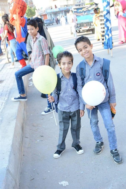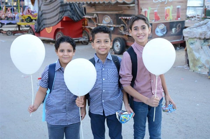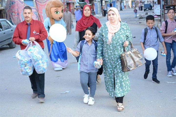بالونات وحلويات علي التلاميذ أمام المدارس ابتهاجا بالعام الدراسي الجديد، مشيرا أنه