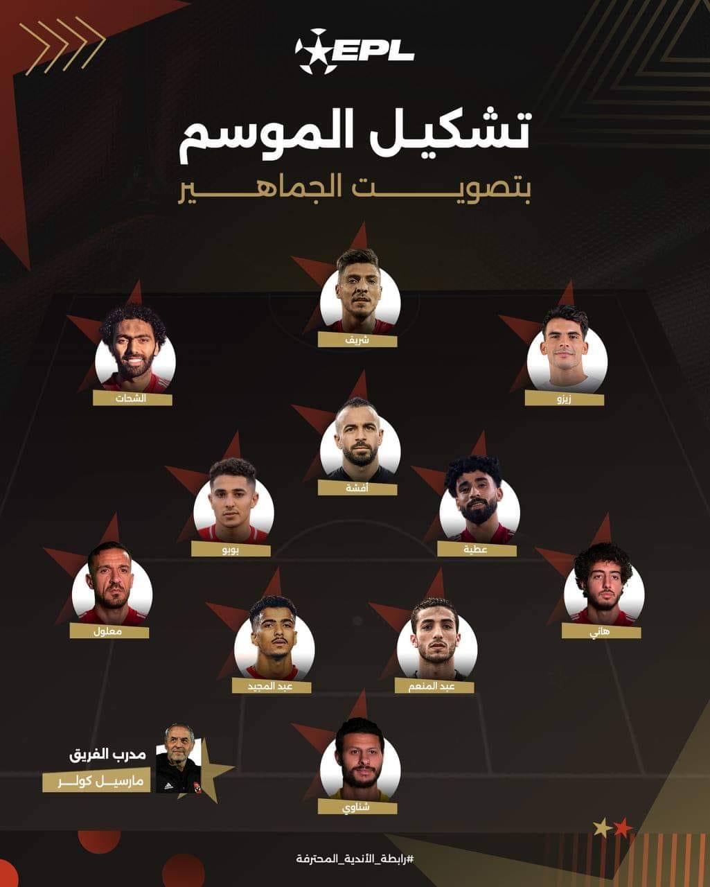 وشهد التشكيل الأفضل سيطرة أهلاوية حيث تواجد 8 لاعبين، مقابل اثنين من الزمالك ولاعب من فيوتشر، كما تواجد السويسري مارسيل كولر كمديرا فنيا للتشكيل الأفضل بعد فوزه بلقب أفضل مدير فني.