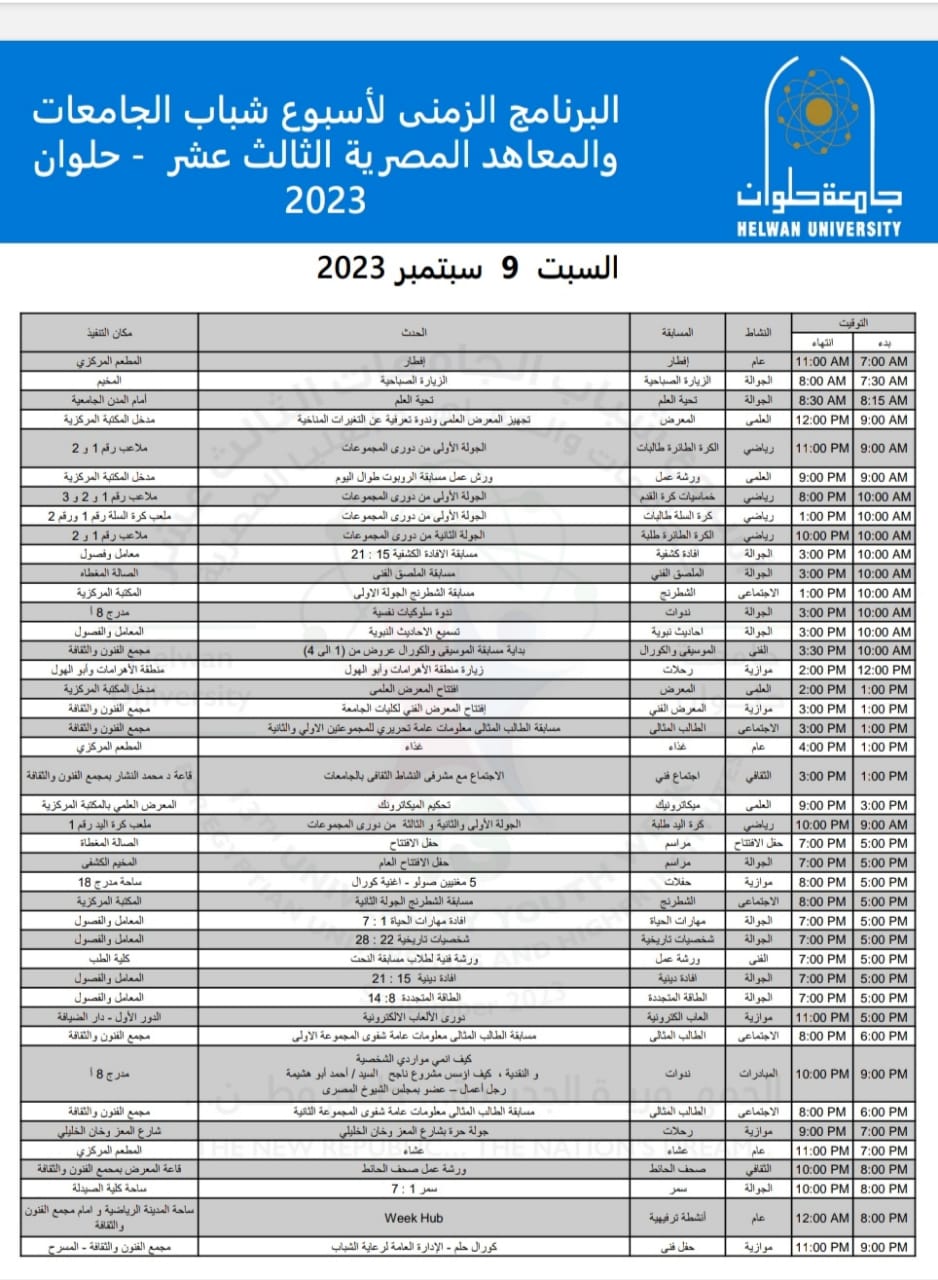 أعلنت جامعة حلوان بالتزامن مع انطلاق فعاليات أسبوع شباب الجامعات عن البرنامج الزمني لأسبوع شباب الجامعات والمعاهد المصرية الثالث عشر ليوم السبت الموافق ٩ سبتمبر ٢٠٢٣، الذي تستضيفه الجامعة برئاسة الدكتور السيد قنديل رئيس جامعة حلوان، حيث تستقبل الجامعة ٤٥ من الجامعات والمعاهد المصرية.