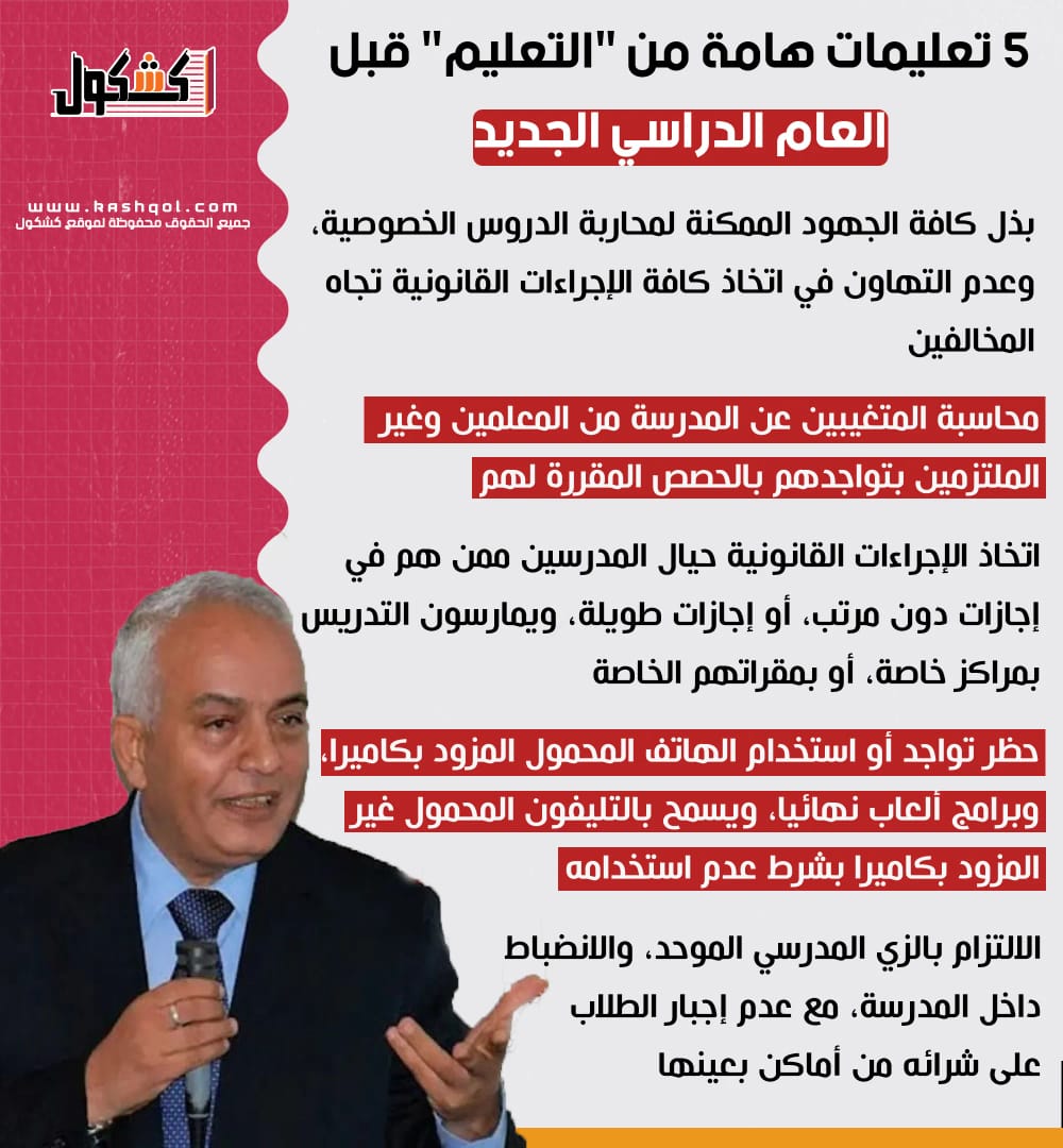 وفيما يلي يقدم "كشكول" أبرز التعليمات التي تضمنها ذلك الكتاب الدوري والخاصة بالاستعداد للعام الدراسي الجديد 2023 – 2024: