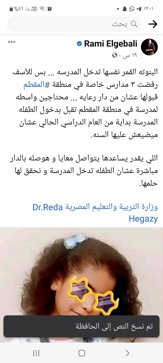 وجاء في الاستغاثة: وقال رواد السوشيال ميديا:"البنوته القمر نفسها تدخل المدرسه... بس للأسف رفضت ٣ مدارس خاصة في منطقة المقطم قبولها عشان من دار رعايهة، محتاجين واسطه لمدرسة في منطقة المقطم تقبل بدخول الطفله المدرسة بداية من العام الدراسي الحالي عشان ميضيعش عليها السنة»