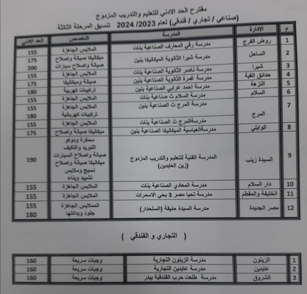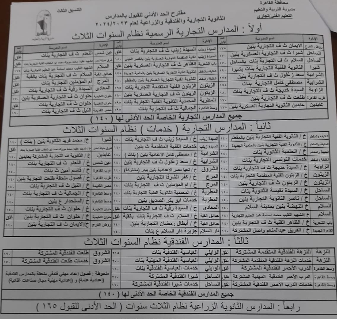 قرر اللواء خالد عبد العال محافظ القاهرة النزول بدرجة الحد الأدنى لتنسيق القبول بمدارس التعليم الفنى (صناعى، تجارى، فندقى، زراعى) للعام الدراسى 2023 / 2024 بالمدارس التى يوجد بها أماكن شاغرة.