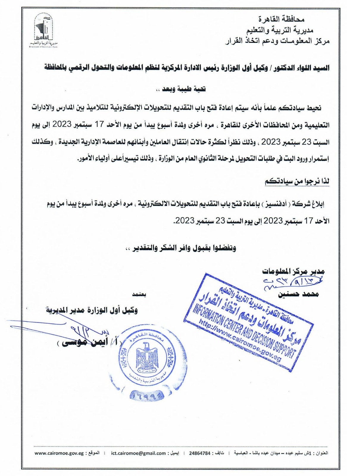 قالت مديرية التربية والتعليم بالقاهرة فى قرار رسمى لها حصلت كشكول على نسخة منه: سيتم إعادة فتح التحويلات الإلكترونية للتلاميذ بين المدارس والادارات التعليمبة ومن المحافظات الاخرى للقاهرة لمدة اسبوع يبدا من الاحد 17 سبتمبر الى يوم السبت 23 سبتمبر وذلك نظرا لكثرة حالات انتقال العاملين وابنائهم للعاصمة الادارية الجديدة.