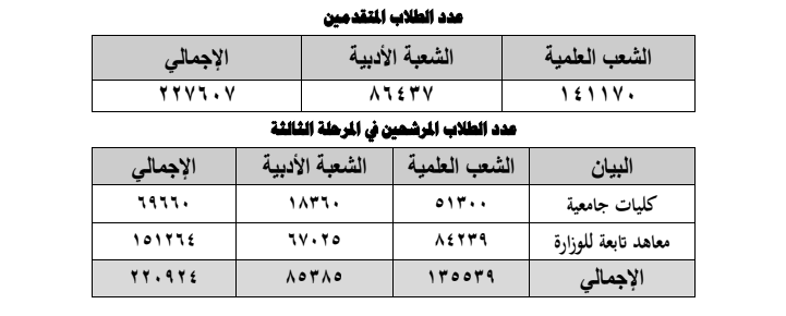 - استنفد عدد (5631) طالب وطالبة من القسم العلمي وعدد (1052) طالب وطالبة من القسم الأدبي، وذلك لتضمينهم رغبات لكليات ومعاهد لا تتناسب مع مجموع درجاتهم، وسوف يتم فتح موقع التنسيق الالكتروني لهم لإبداء رغبات جديدة تتماشي مع الحد الأدنى المعلن.