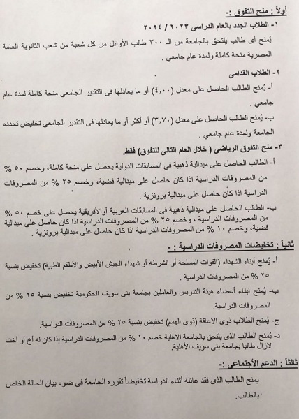 كما أصدر الدكتور منصور حسن القائم بأعمال رئيس جامعة بني سويف الأهلية، قرارًا بشأن القواعد والشروط العامة المنظمة للمنح والتخفيضات في الرسوم الدراسية لطلاب جامعة بنى سويف الاهلية خلال العام الدراسي 2023 / 2024، على النحو التالي: