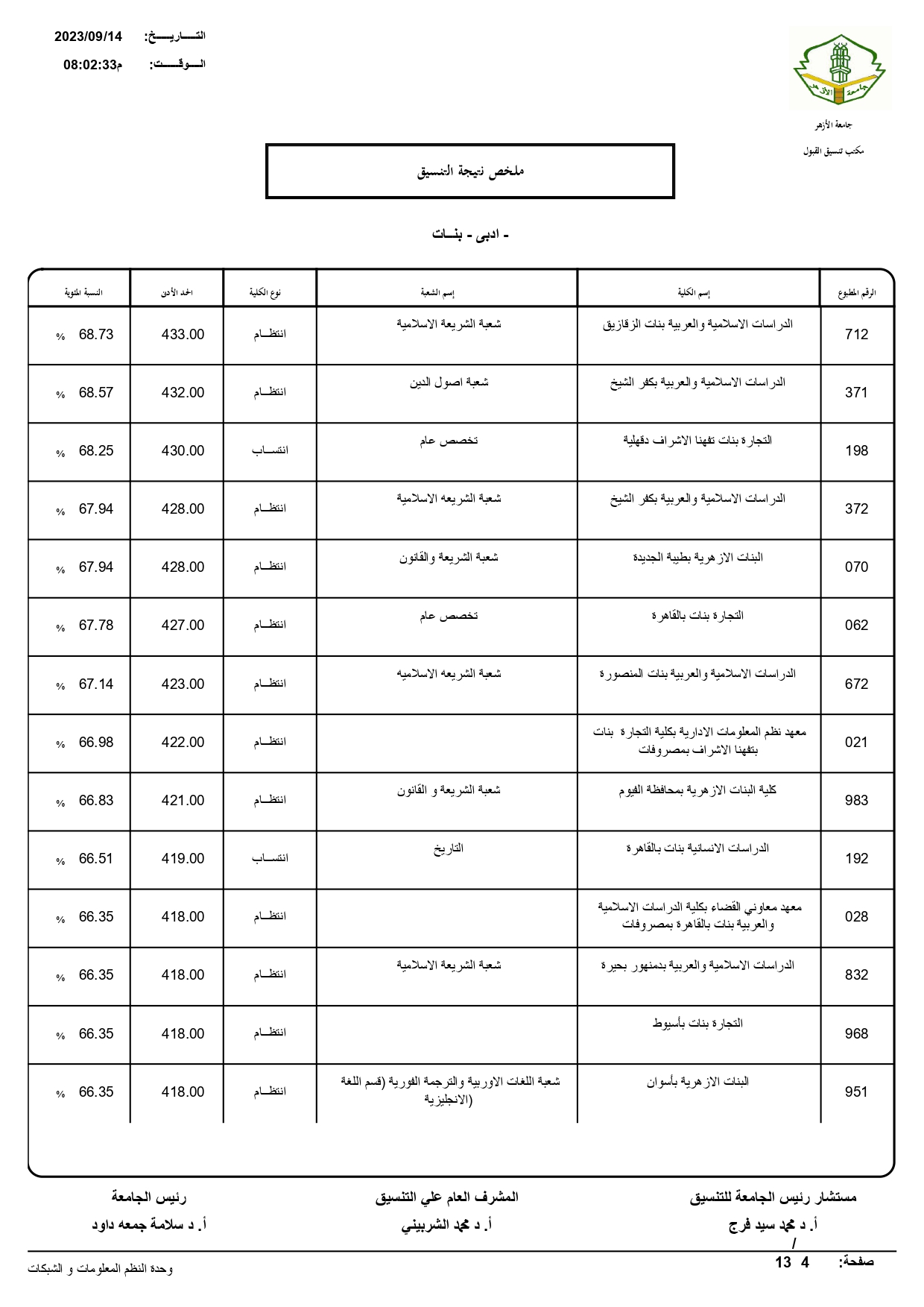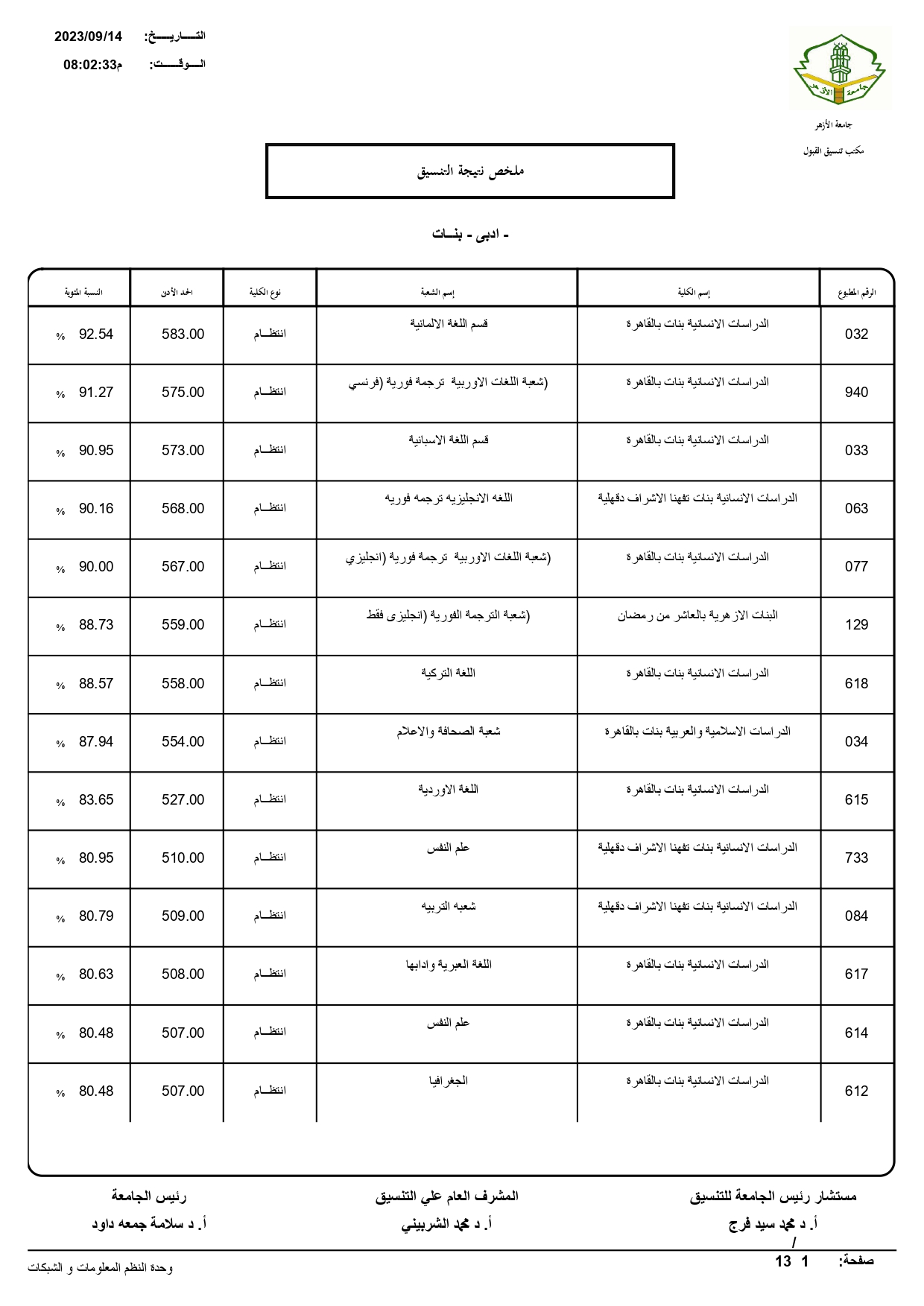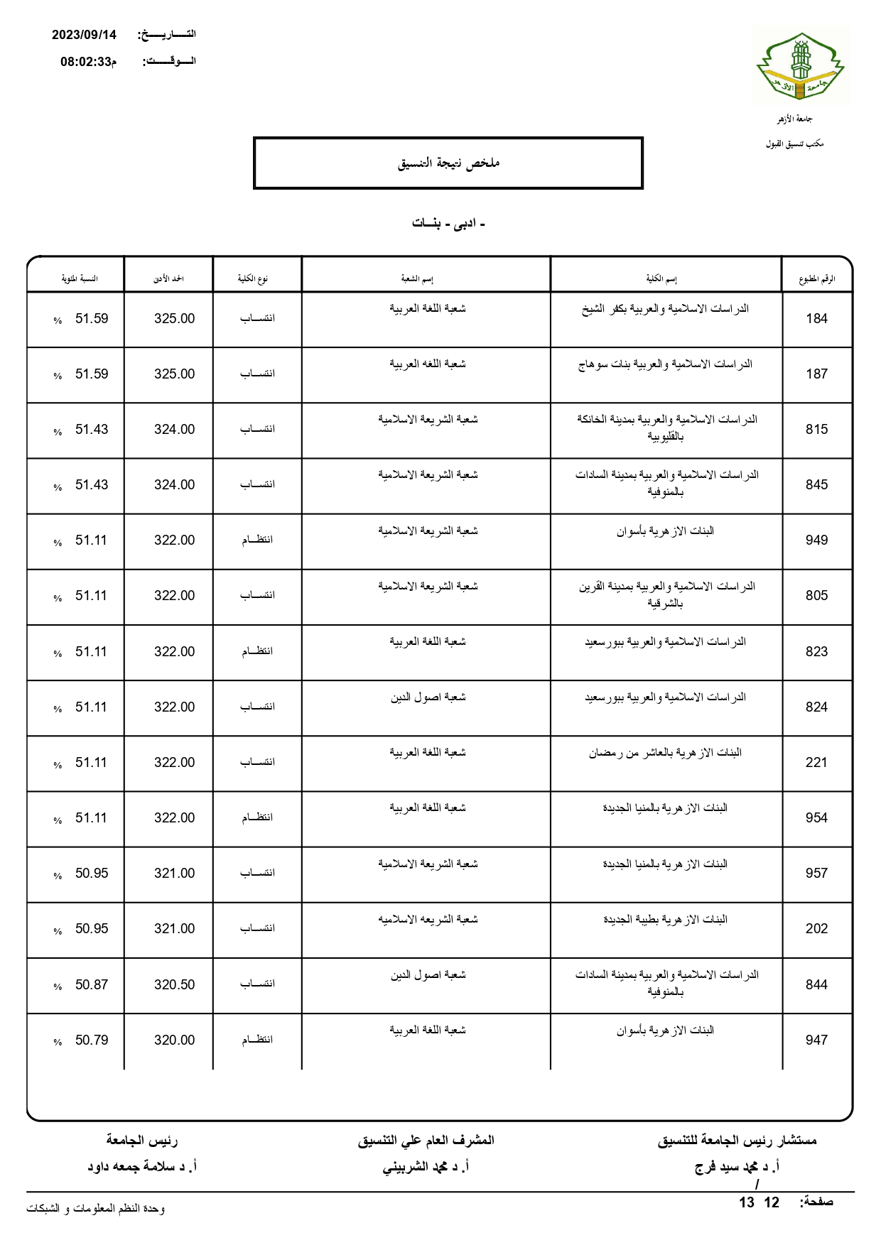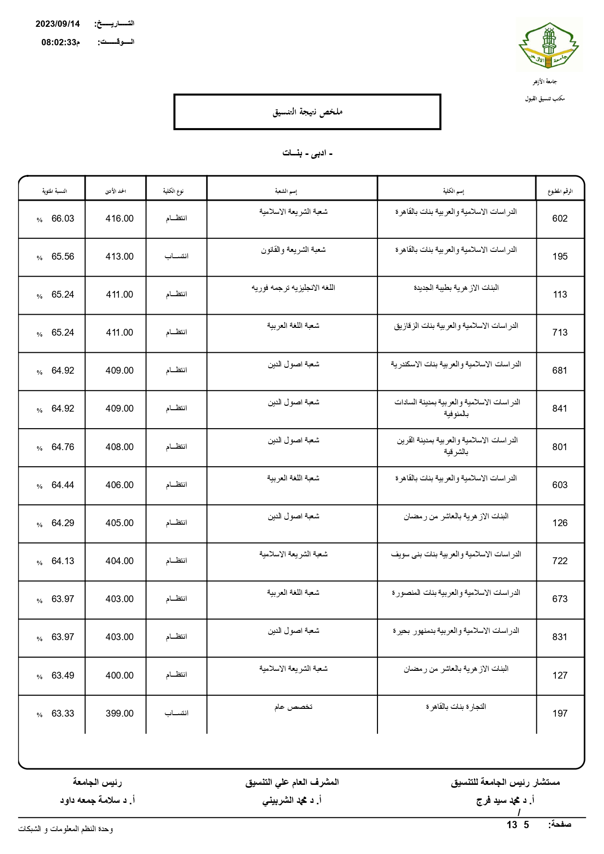 أعلن الدكتور سلامه داود رئيس جامعة الأزهر، نتيجة تنسيق القبول للعام الجامعي 2023/ 2024م، حيث بلغ عدد المتقدمين للتنسيق ٧٢١٣٠.