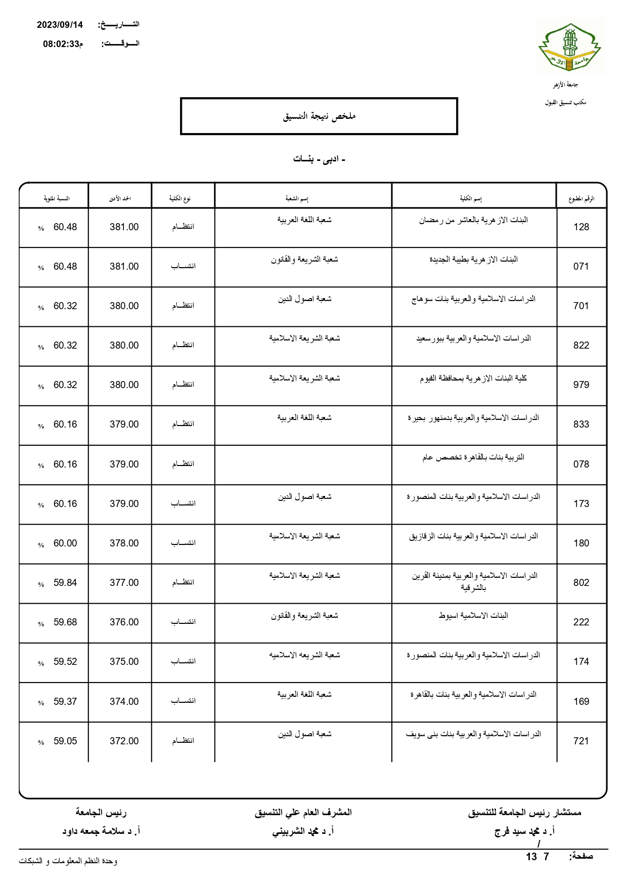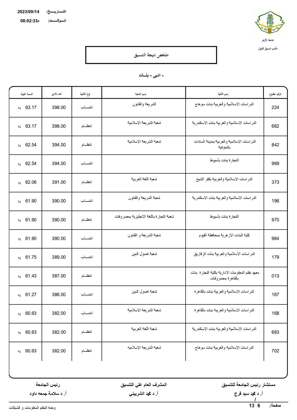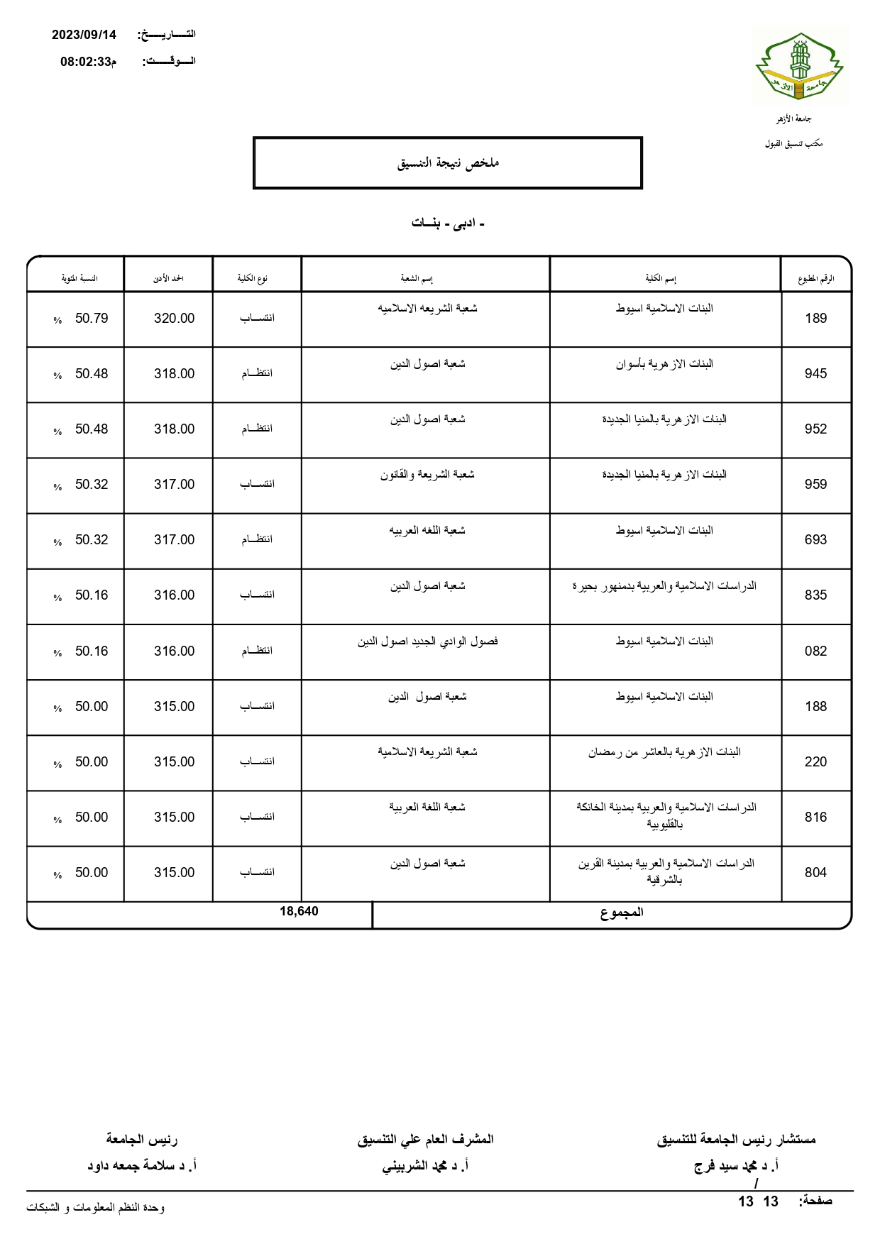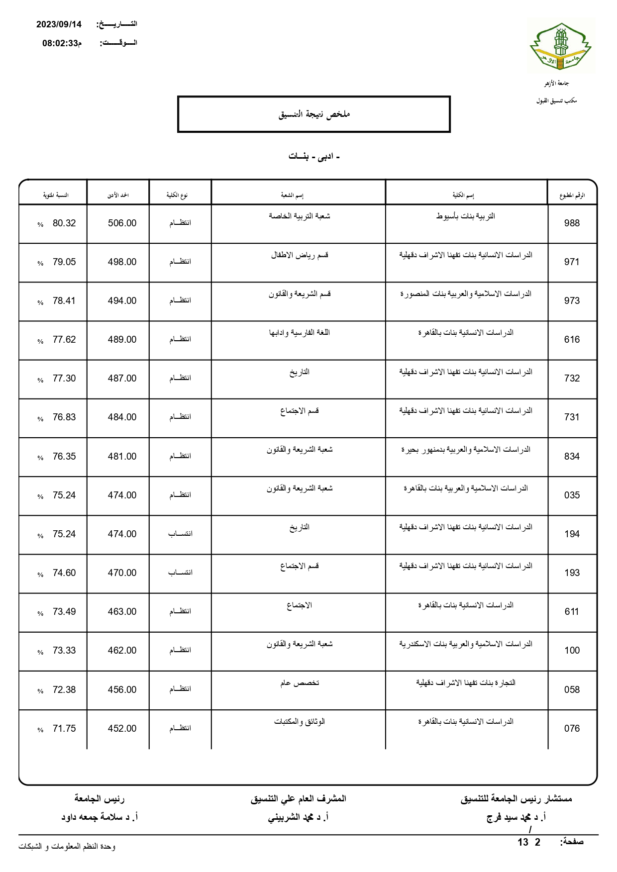 أعلن الدكتور سلامه داود رئيس جامعة الأزهر، نتيجة تنسيق القبول للعام الجامعي 2023/ 2024م، حيث بلغ عدد المتقدمين للتنسيق ٧٢١٣٠.