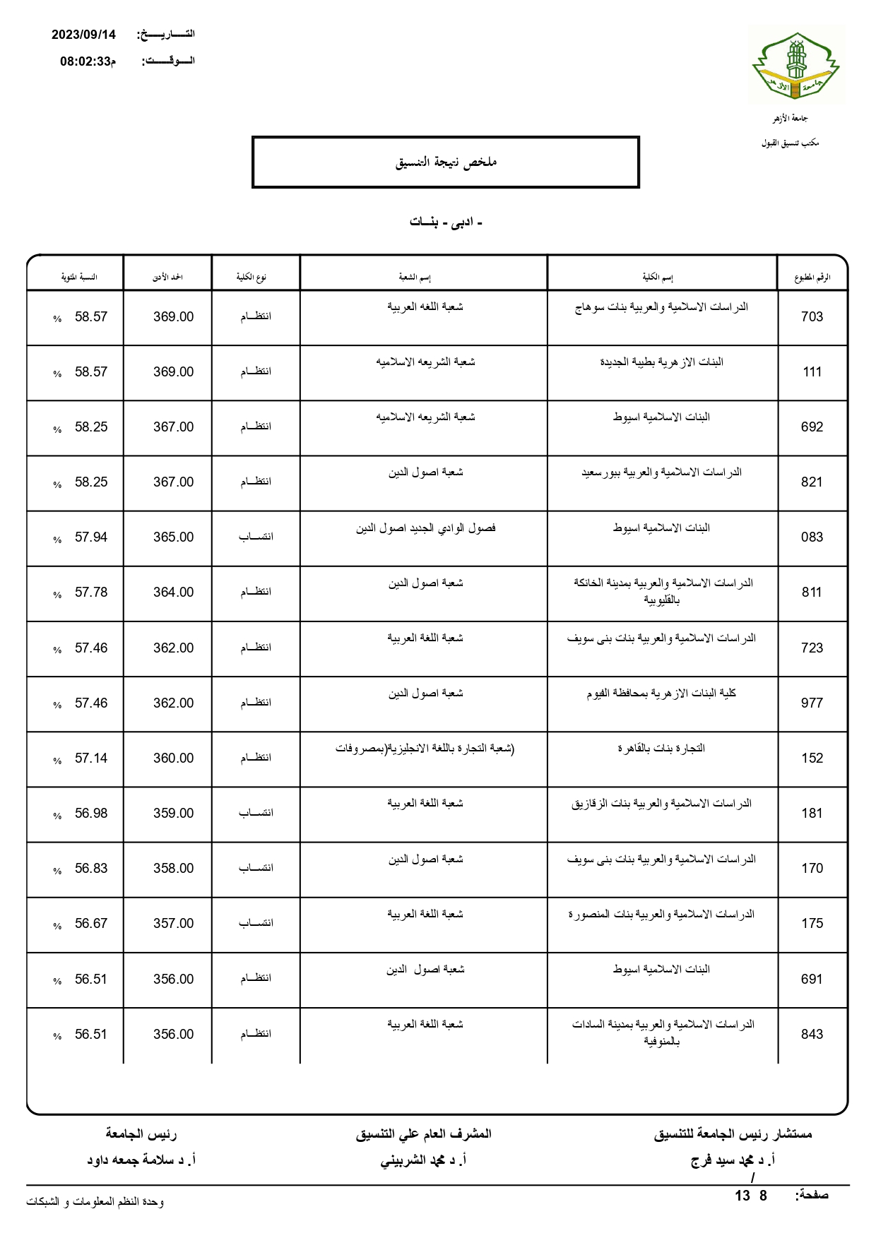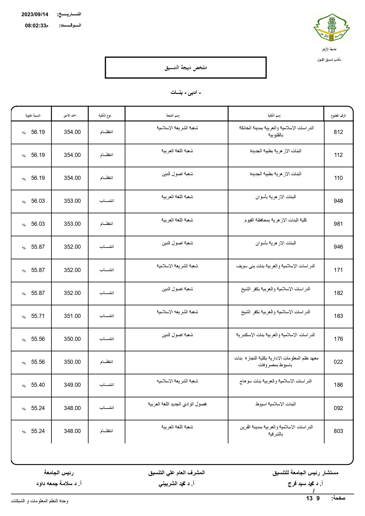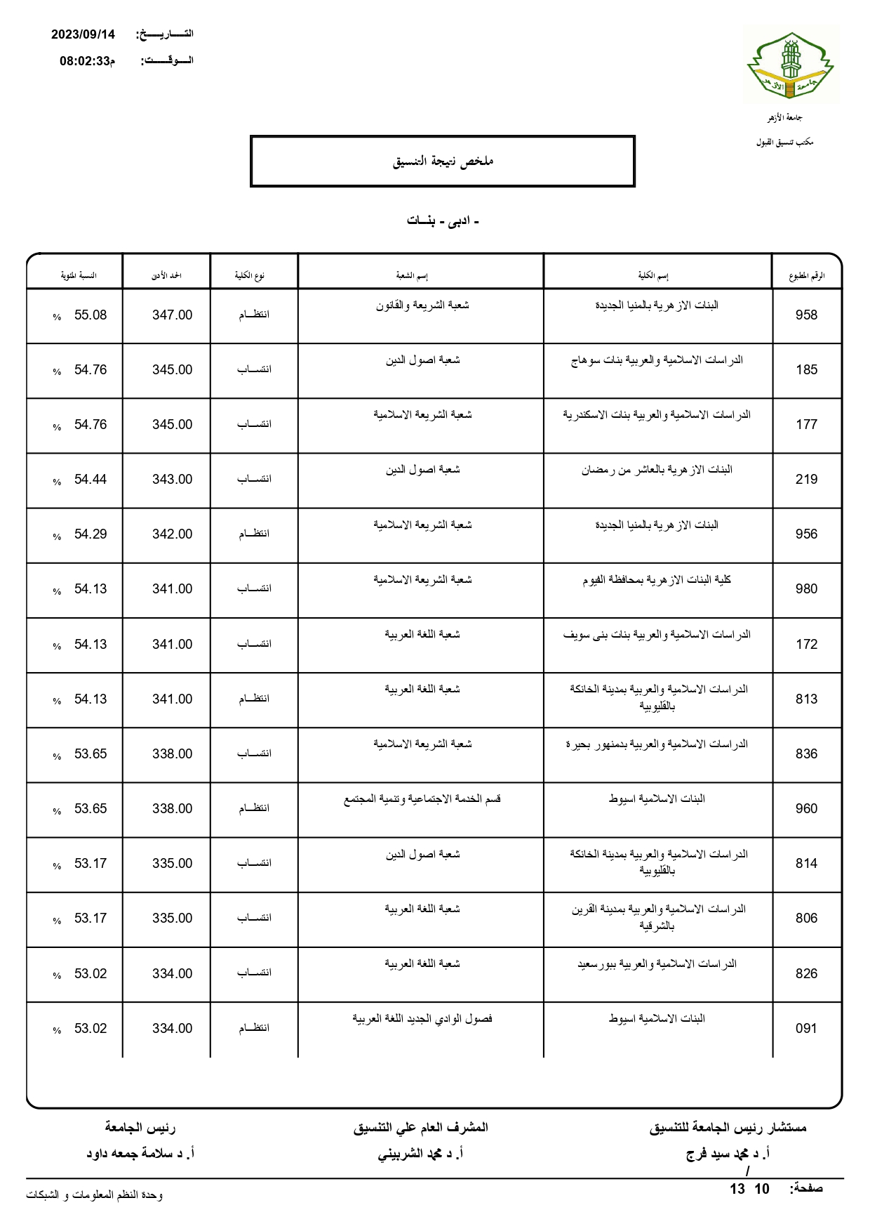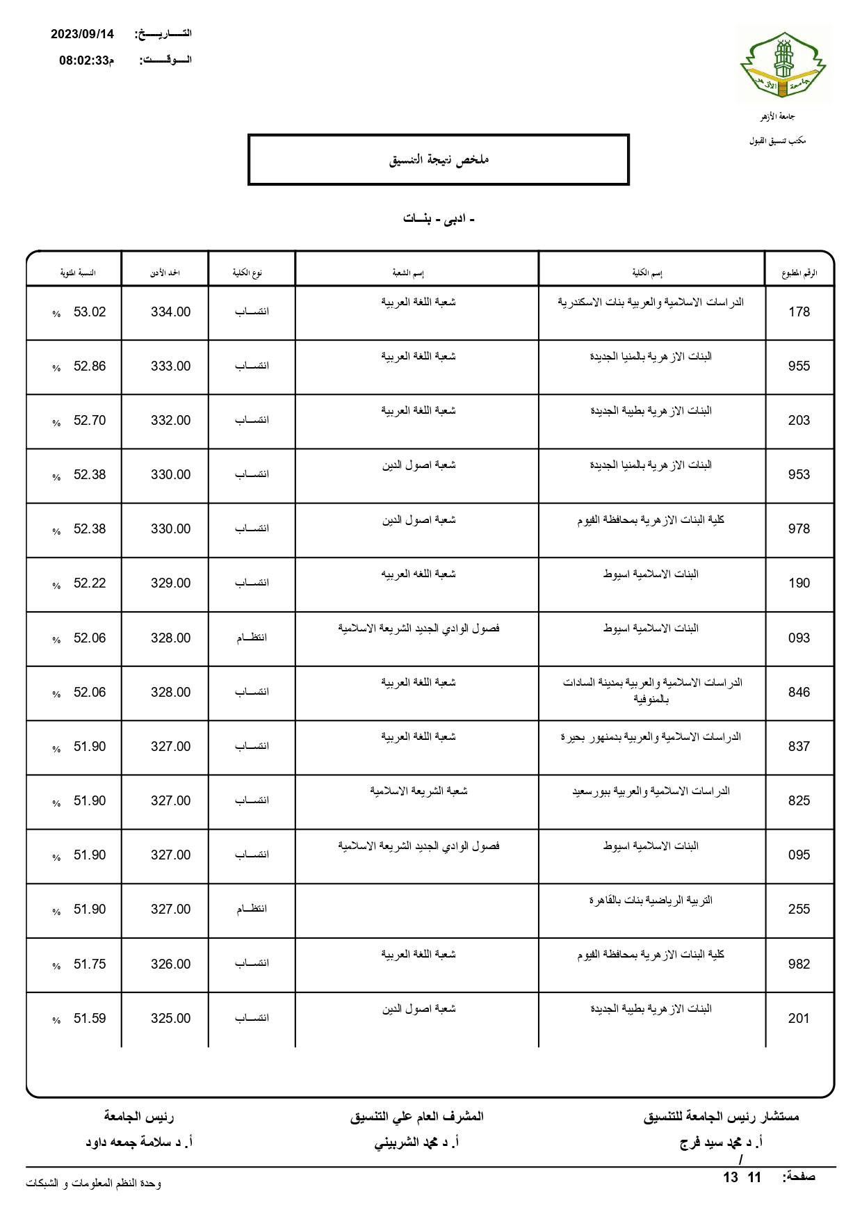 أعلن الدكتور سلامه داود رئيس جامعة الأزهر، نتيجة تنسيق القبول للعام الجامعي 2023/ 2024م، حيث بلغ عدد المتقدمين للتنسيق ٧٢١٣٠.