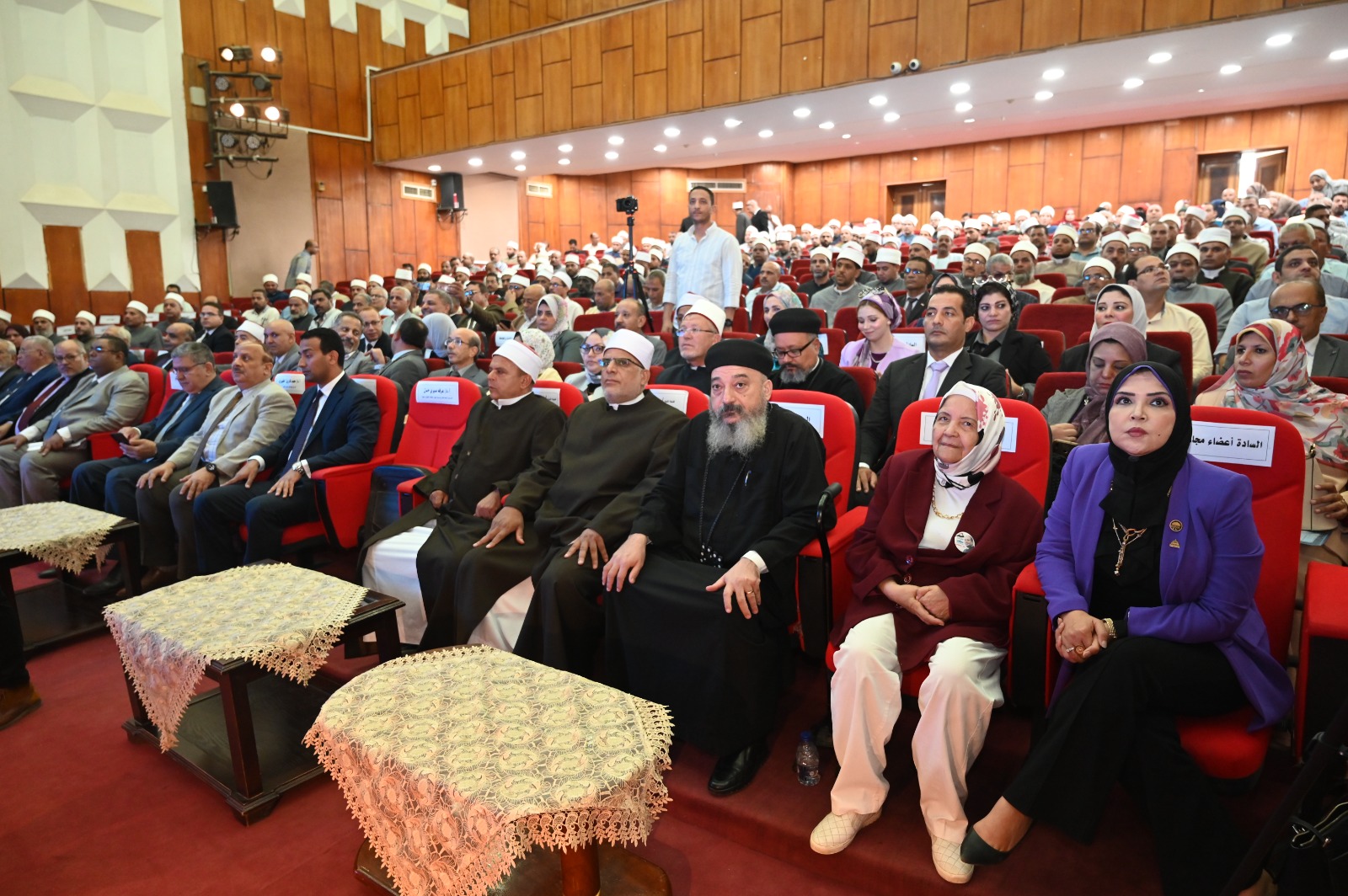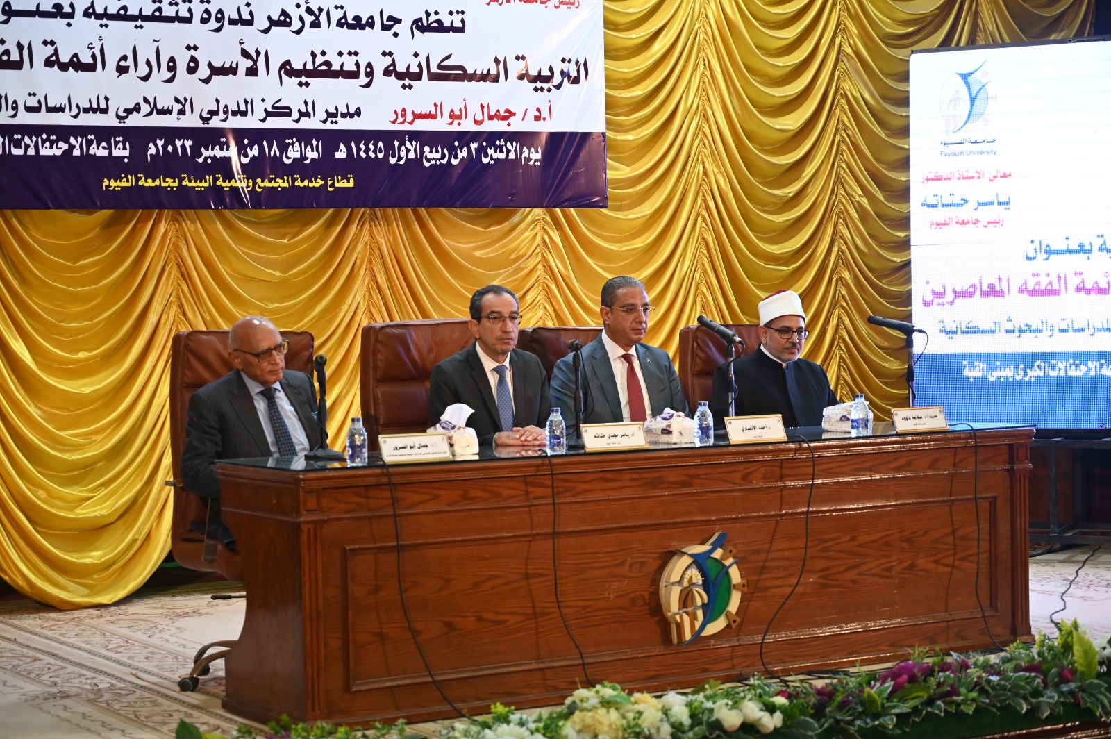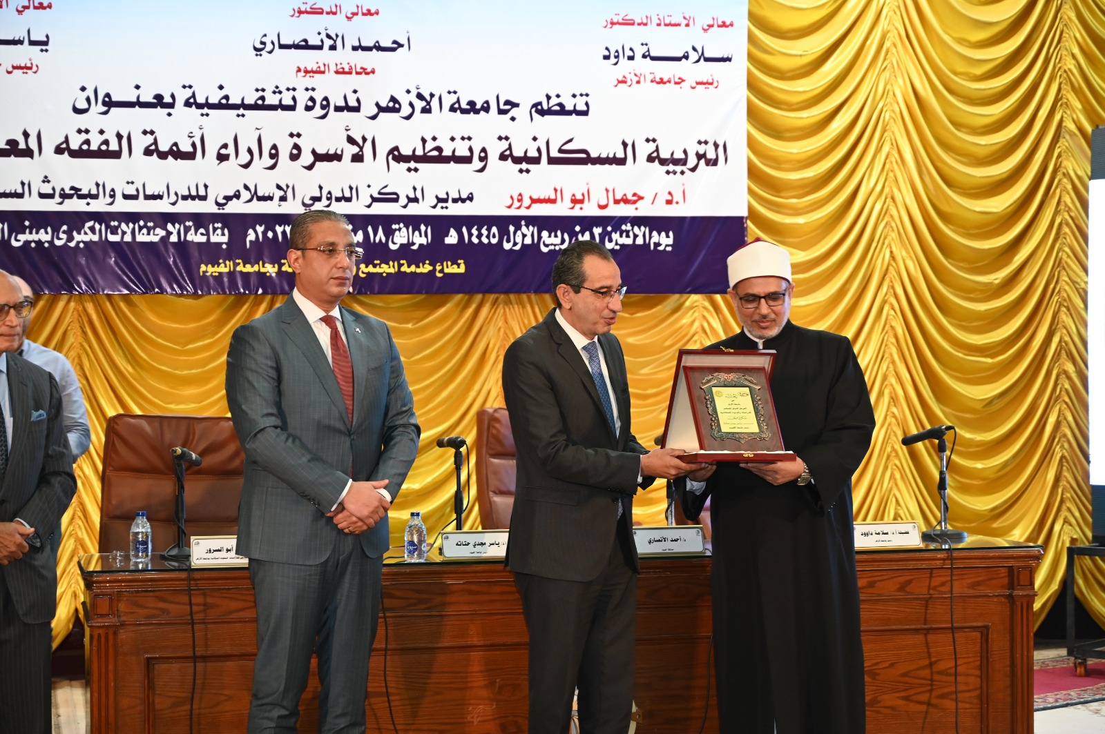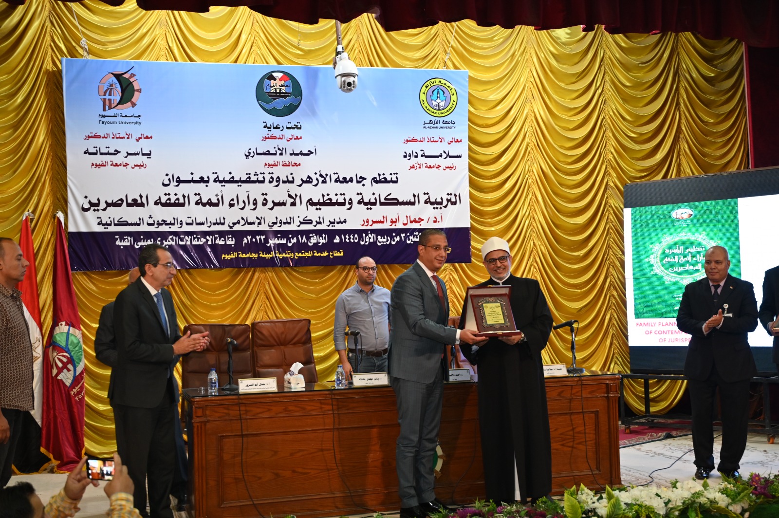 جاء ذلك بحضور الدكتور محمد فاروق الخبيري نائب رئيس الجامعة لشئون التعليم والطلاب، والدكتور محمد عماد نائب محافظ الفيوم، والدكتور جمال أبو السرور مدير المركز الدولي الإسلامي للدراسات والبحوث السكانية بجامعة الأزهر، واعضاء المركز، وعدد من عمداء الكليات ووكلائها وأعضاء مجلسي النواب والشيوخ، وعدد من وكلاء الوزارات بمحافظة الفيوم، وممثلي منطقة الفيوم الأزهرية، والأوقاف والكنيسة، والمجلس القومي للمرأة، والتنفيذيين والشعبيين، وذلك اليوم الاثنين الموافق ١٨ من سبتمبر ٢٠٢٣، بقاعة الاحتفالات الكبرى بالجامعة.
