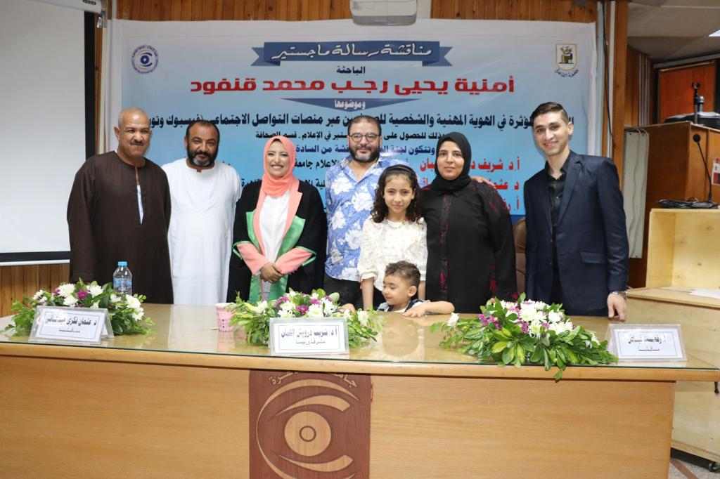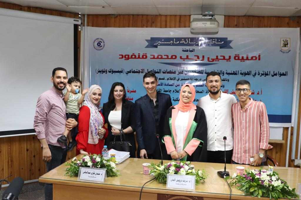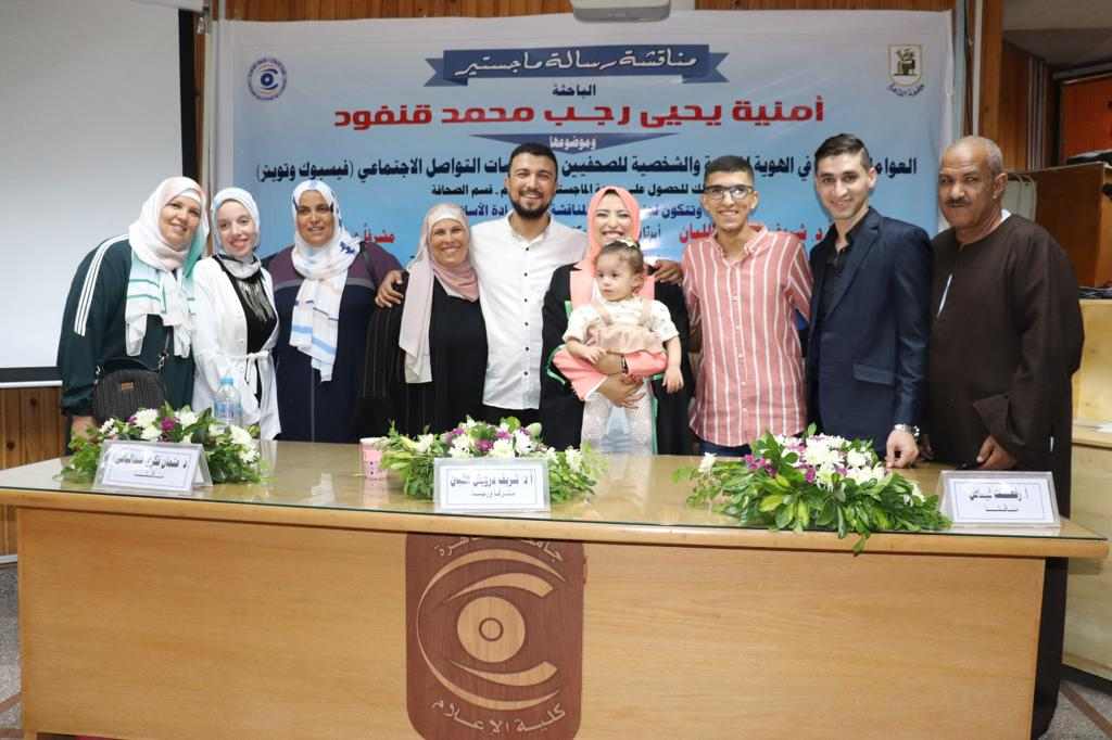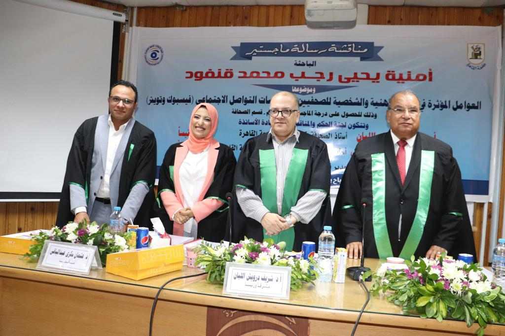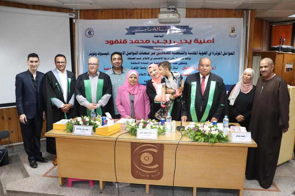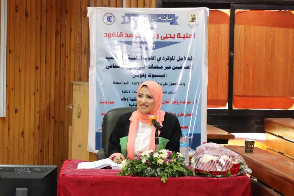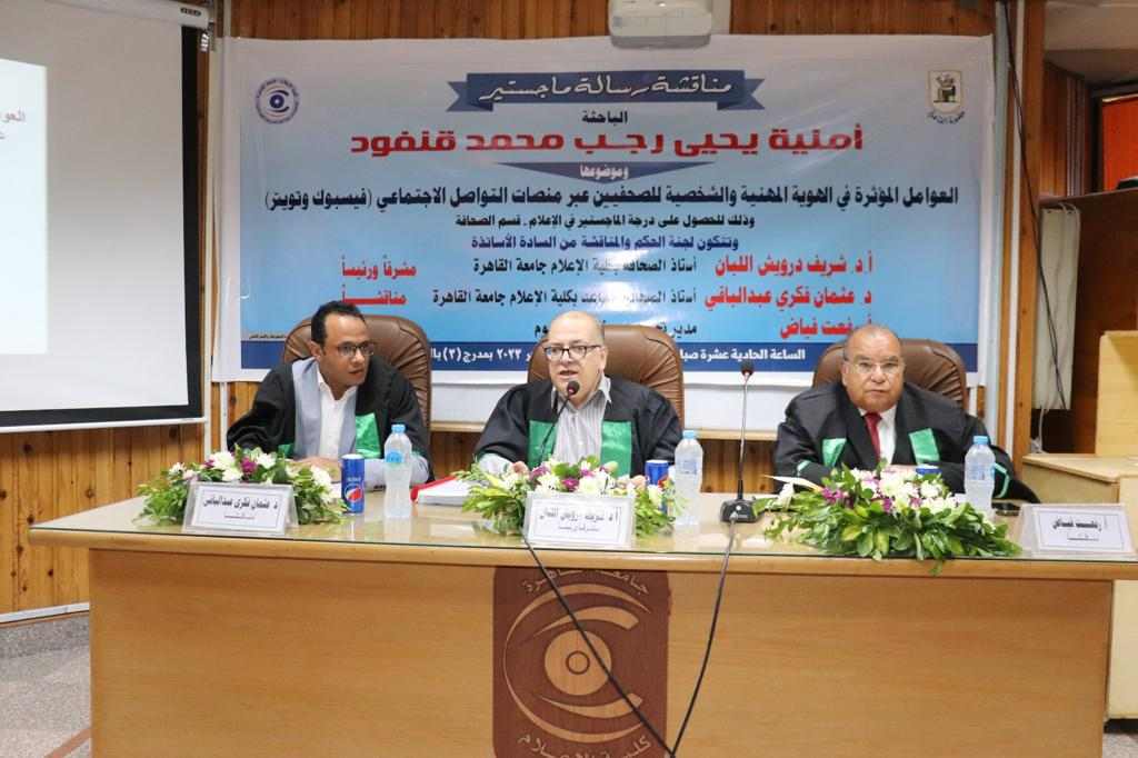 ناقشت كلية الإعلام جامعة القاهرة، رسالة ماجستير للباحثة أمنيه يحى رجب محمد قنفود المعيدة بقسم الصحافة بكلية الإعلام جامعة القاهرة، وكانت الرسالة بعنوان "العوامل المؤثرة في الهوية المهنية والشخصية للصحفيين عبر منصات التواصل الاجتماعي (فيسبوك وتويتر).. دراسة ميدانية"، تحت إشراف الدكتور شريف درويش اللبان رئيس قسم الصحافة بكلية الإعلام جامعة القاهرة، وتم منح الباحثة درجة الماجستير بتقدير امتياز.