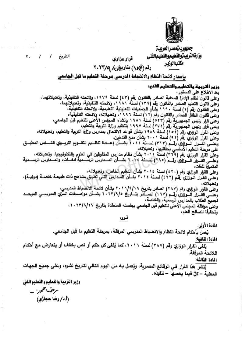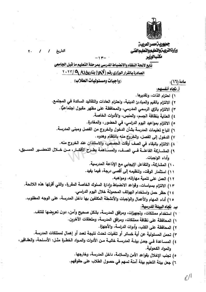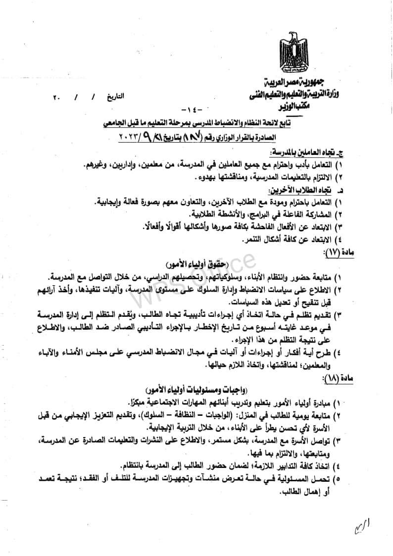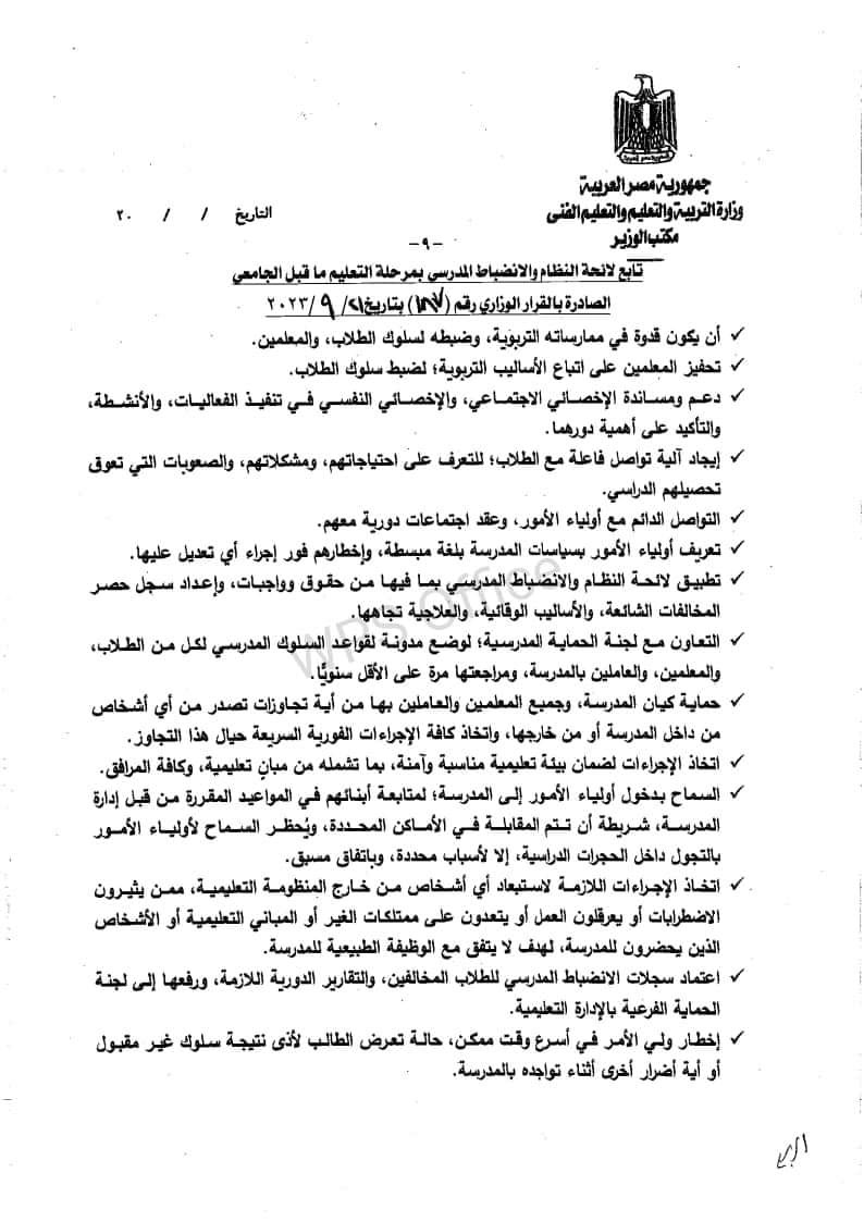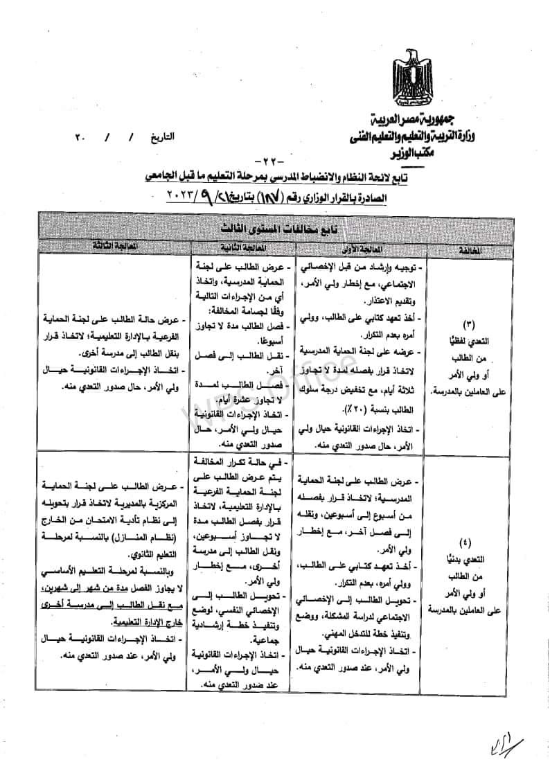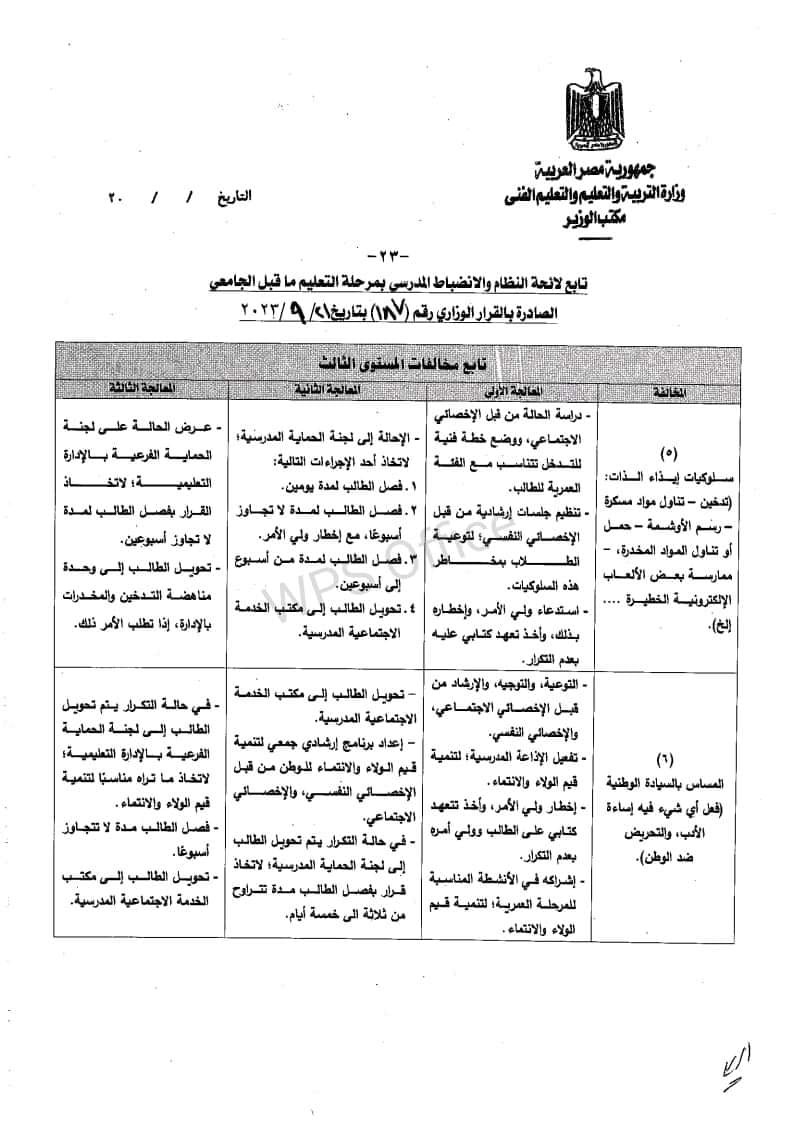 مدارس التعليم تصدر قرار لائحة الانضباط المدرسي.. «كشكول» ينشر نسخة منها ريم محمود الجمعة 22/سبتمبر/2023 - 02:09 م 9/22/2023 2:09:18 PM رضا حجازي طباعة أصدرت وزارة التربية والتعليم والتعليم الفني قرار لائحة الانضباط المدرسى الجديدة القرار رقم 187 بتاريخ 2023/9/21 وحصل موقع كشكول علي نسخة منها وهي كالتالي: facebook twitter whats شارك