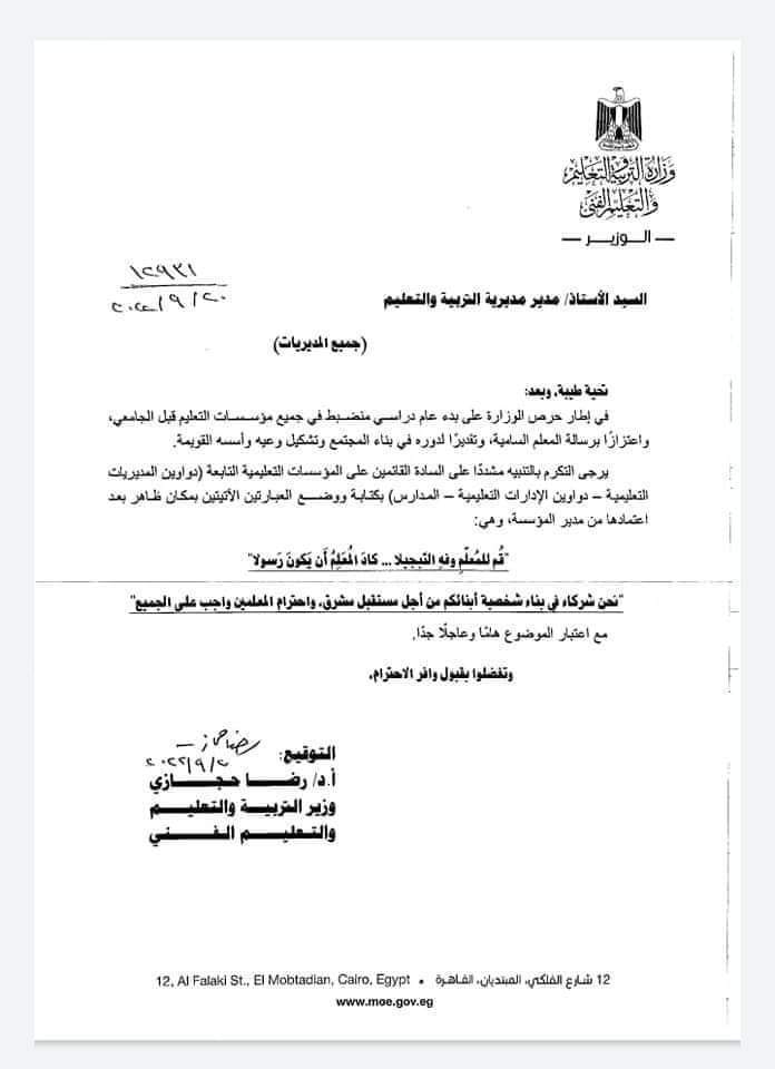 وأوضحت أنه في إطار حرص الوزارة على بدء عام دراسي منضبط في جميع مؤسسات التعليم قبل الجامعي واعتزازا برسالة المعلم السامية، وتقديرا لدوره في بناء المجتمع وتشكيل وعيه وأسسه القويمة.