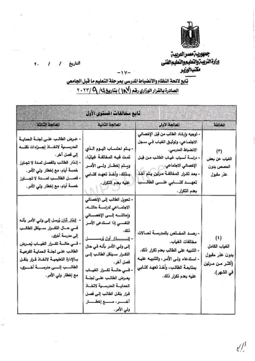 وأضافت أنه في حال تكرار المخالفة مرتين يتم أخذ تعهد كتابي على الطالب بعدم التكرار، ويتم احتساب اليوم الذي تمت فيه الخالفة غيابا ويتم إخطار ولي الأمر بذلك وأخذ تعهد كتابي عليه بعدم التكرار