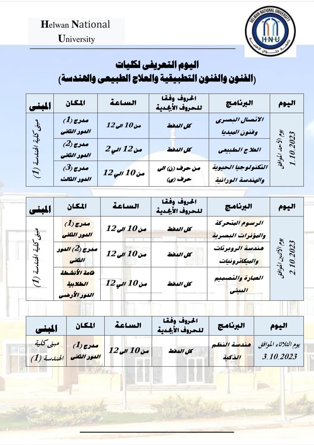 - هندسة الروبوتات والميكاترونيك، وذلك يوم الاثنين الموافق ٢ أكتوبر ٢٠٢٣ لجميع الدفعة من الساعة ١٠-١٢ بمدرج (٢) الدور الثاني كلية هندسة (١).