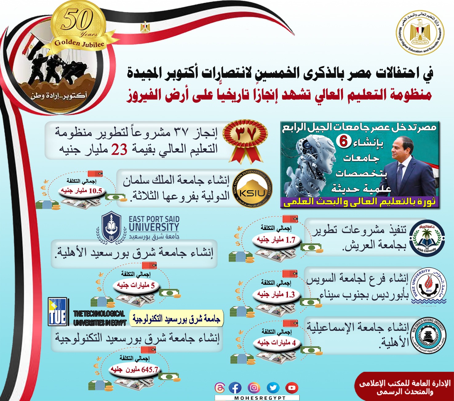 وأوضح الدكتور عادل عبدالغفار المستشار الإعلامي والمتحدث الرسمي لوزارة التعليم العالي والبحث العلمي، أن الوزارة نفذت أكثر من 37 مشروعًا في مجال التعليم العالي بسيناء خلال السنوات التسع الماضية، بتكلفة إجمالية بلغت 23 مليار جنيه، موضحًا أن جهود تنمية سيناء تؤكد وضعها في مقدمة خريطة التنمية الشاملة والمُستدامة وفقًا لرؤية مصر(2030).