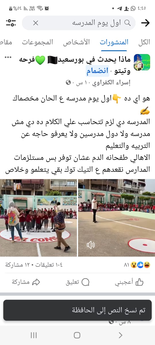 وزعم البعض أن هذا الفيديو يخص إحدى مدارس بورسعيد، وتنوعت التعليقات بين أولياء الامور حيث قالت سها محمد:«الفكرة حلوة وكل أطفالنا عارفين الاغنية ومتنسوش أن أول يوم هو يوم أحتفال».