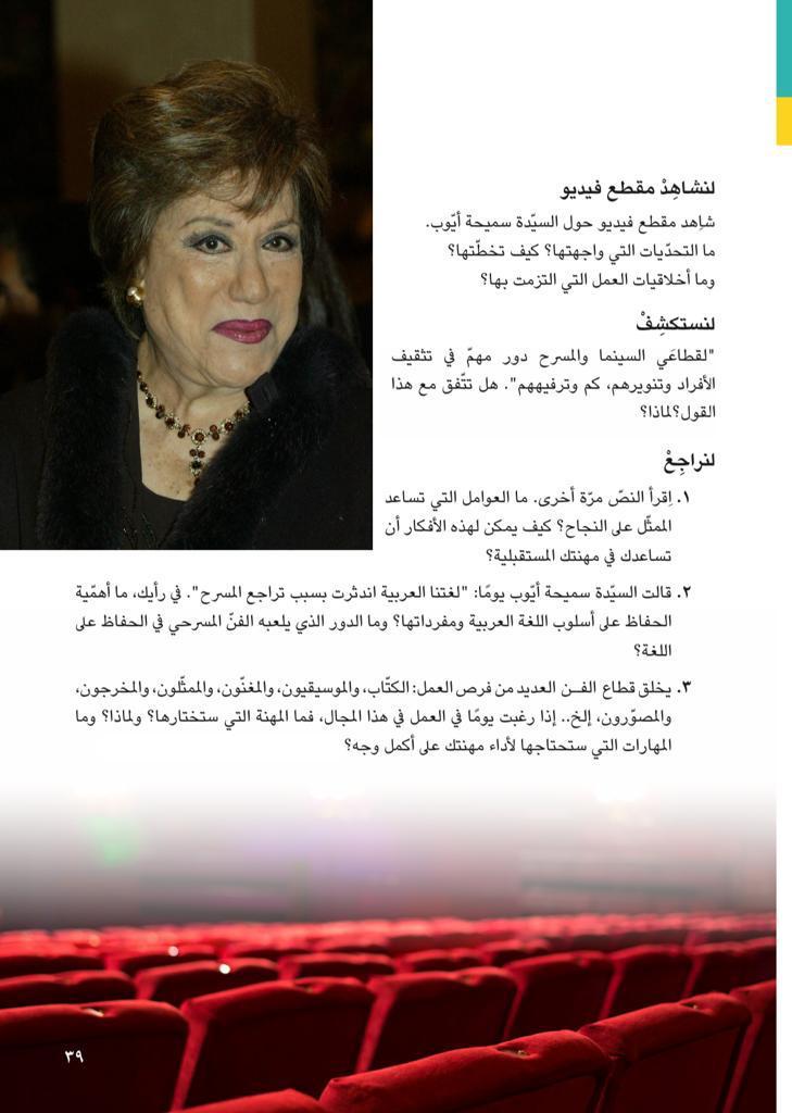 وفيما يلي ينشر "كشكول" نص درس الفنانة سميحة أيوب كما جاء في كتاب المهارات المهنية الخاص بطلاب الصف السادس الابتدائي، والذي استعرض تاريخ سيدة المسرح العربى، ونص الدرس شخصیات مصرية مؤثرة "في مجال المسرح" سميحة أيوب.