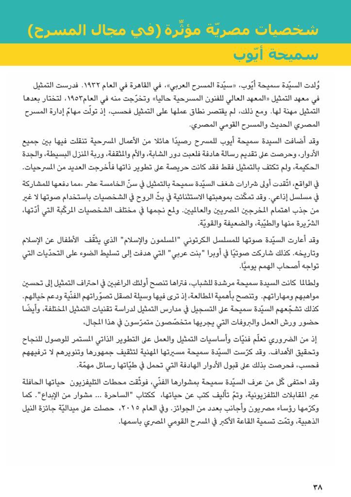 وأضافت وزارة التربية والتعليم والتعليم الفني أن الصفحات المتداولة على مواقع التواصل الاجتماعي للتفاصيل المغلوطة المتعلقة بتاريخ الفنانة سميحة أيوب ليس لها علاقة بكتاب الوزارة ولا تمد له بصلة.
