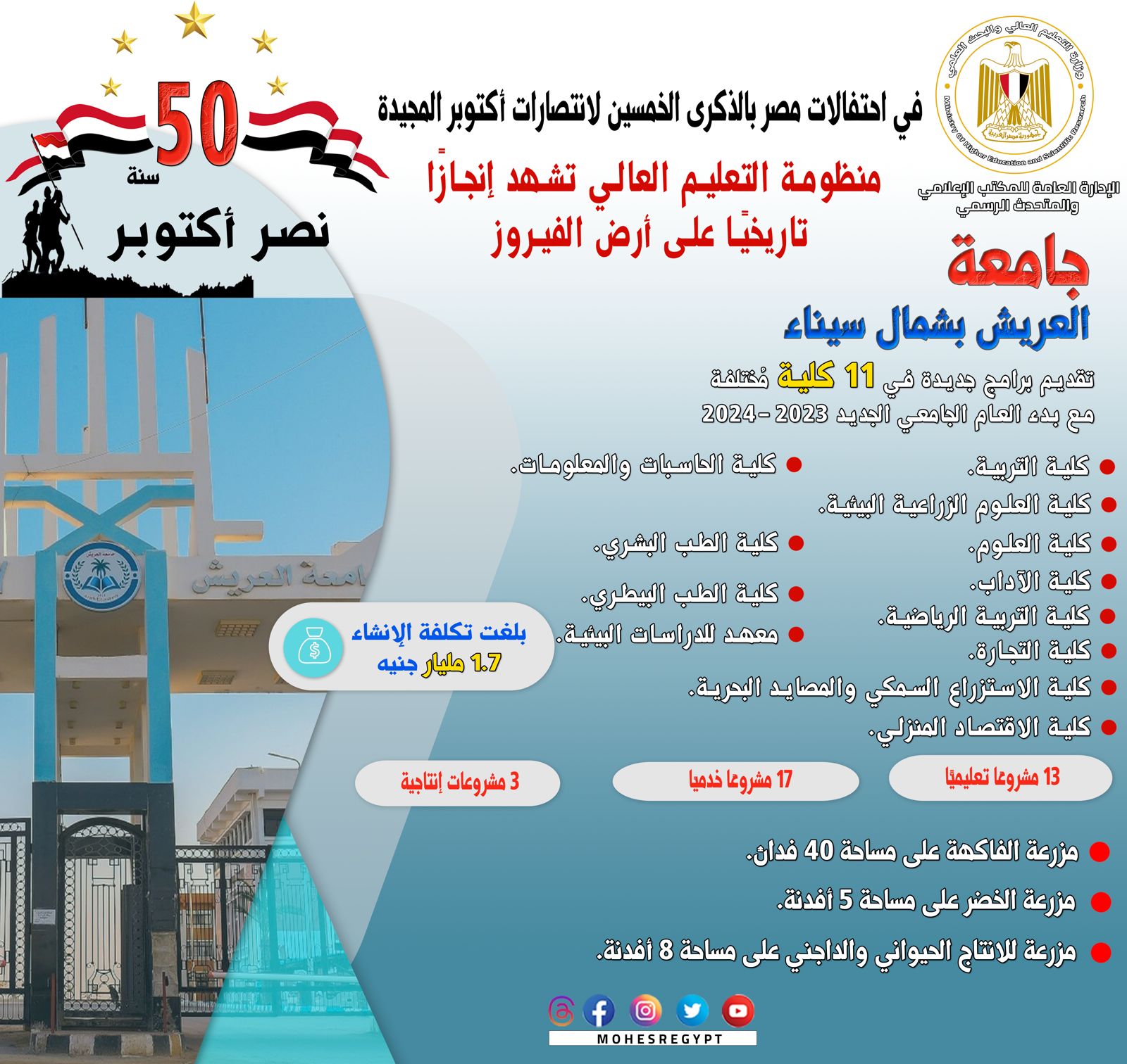 وأشار وزير التعليم العالي والبحث العلمي، إلى أن جامعة العريش تعُد صرحًا علميًّا متميزًا، ونموذجًا مضيئًا على أرض سيناء، حيث تلعب دورًا هامًا في مسيرة التنمية بسيناء منذ صدور القرار الجمهوري لها كجامعة مستقلة عام 2016، مشيرًا إلى أن الدولة ضخت ما يقرب من 1.7 مليار جنيه لتنفيذ مشروعات تطوير بالجامعة، تنوعت ما بين 13 مشروعًا تعليميًّا و17 خدميًا، و3 مشروعات إنتاجية.