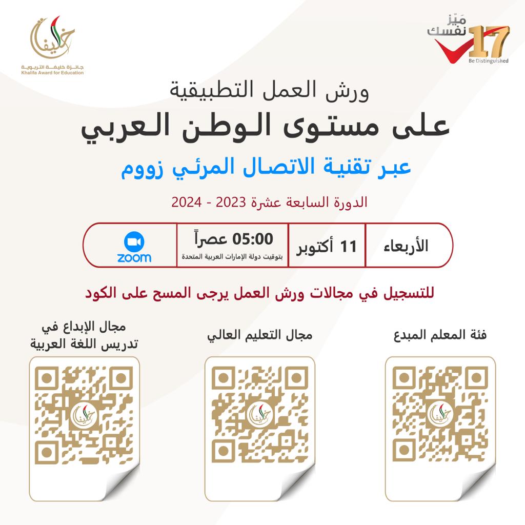 أعلنت الأمانة العامة لجائزة خليفة التربوية التي تطلقها دولة الإمارات العربية سنويًا، برنامج ورش العمل التطبيقية لدورتها السابعة عشرة 2023-2024 في الميدان التربوي على مستوى الوطن العربي في مجالات التعليم العالي، والتعليم العام" فئة المعلم المبدع"، والإبداع في تدريس اللغة العربية، وذلك عبر تقنية الاتصال المرئي زووم يوم الأربعاء 11 أكتوبر الجاري الساعة الخامسة عصرًا إلى السادسة مساء بتوقيت دولة الإمارات العربية المتحدة.