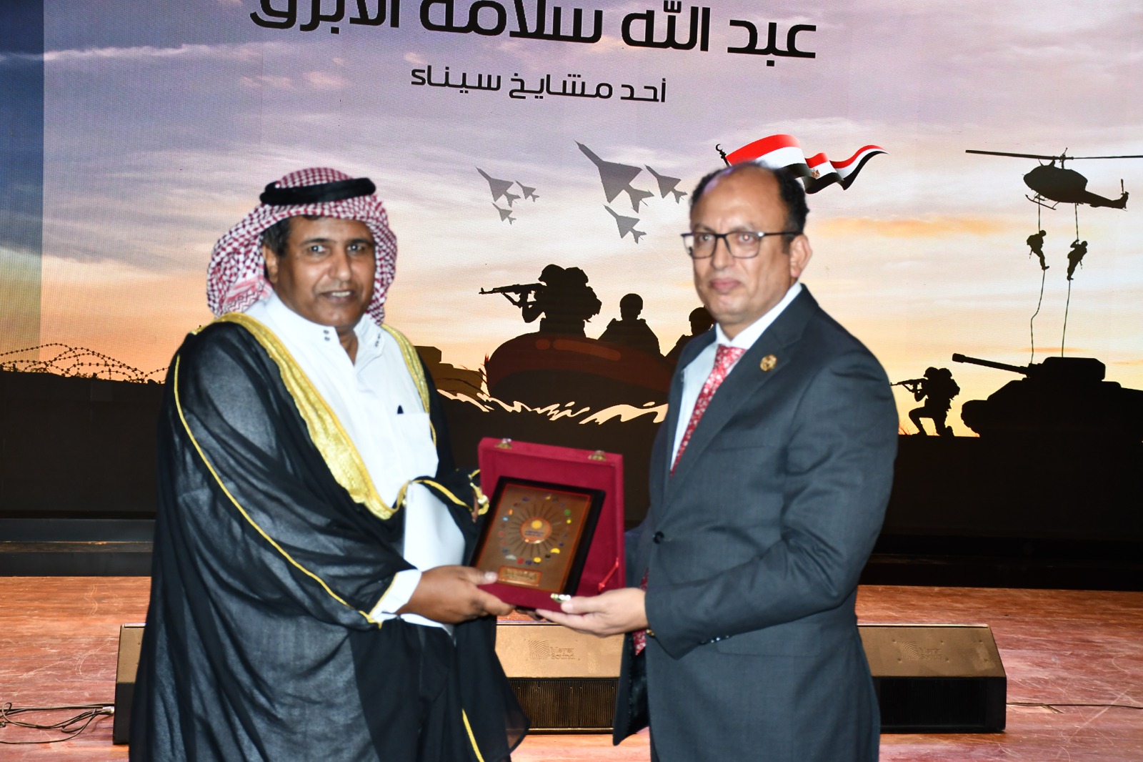 وفى ختام الاحتفالية قام الدكتور السيد قنديل بتكريم اللواء دكتور إسماعيل سيد إسماعيل، والشيخ عبدالله سلامة الأبرق أحد مشايخ سيناء.