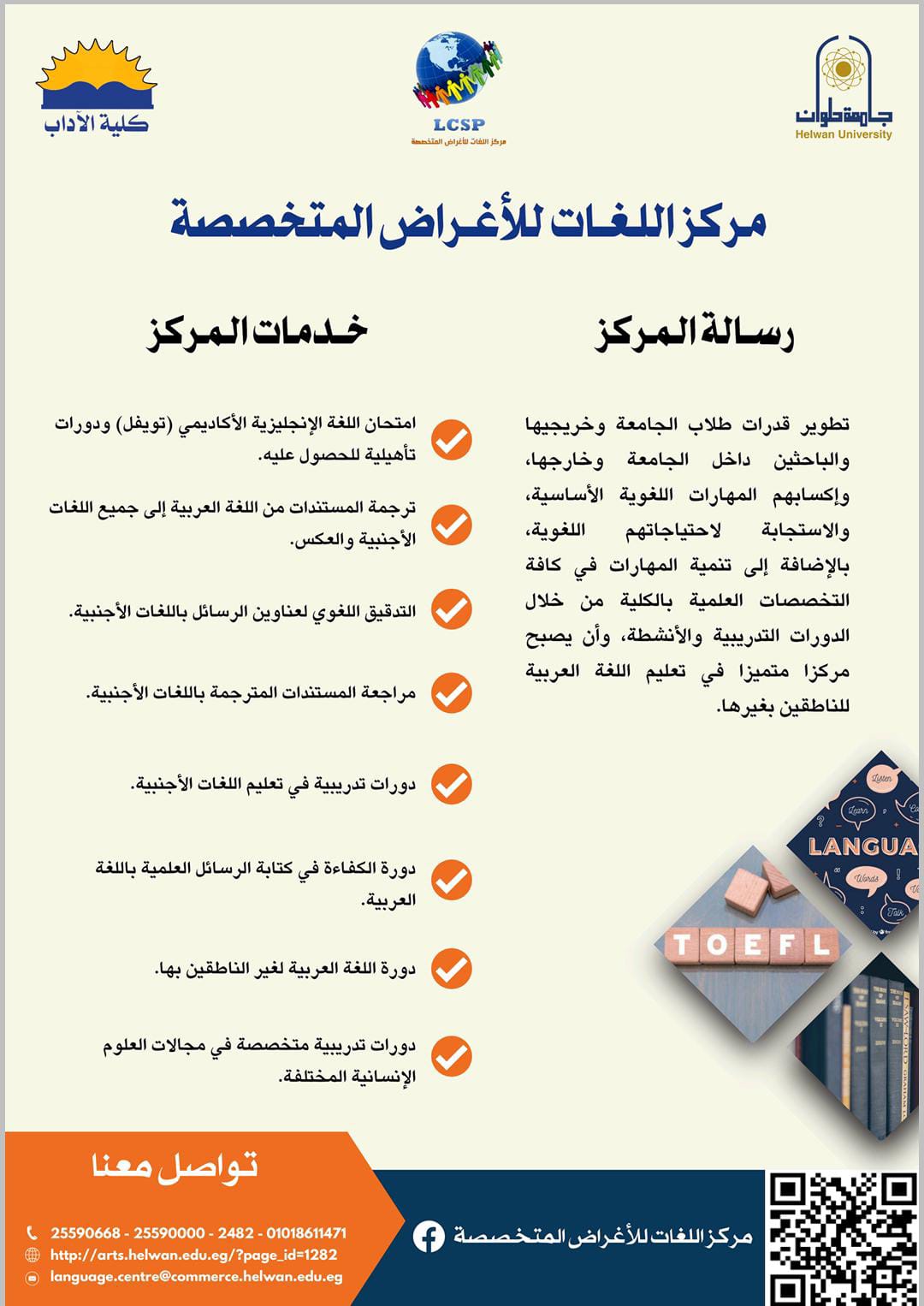 أعلن مركز اللغات للأغراض المتخصصة بكلية الآداب جامعة حلوان للطلاب الجدد عن رسالته والخدمات التي يقدمها وتتمثل رسالة المركز في تطوير قدرات طلاب الجامعة وخريجيها والباحثين داخل الجامعة وخارجها، وإكسابهم المهارات اللغوية الأساسية والاستجابة لاحتياجاتهم اللغوية بالإضافة إلى تنمية المهارات في كافة التخصصات العلمية بالكلية من خلال الدورات التدريبية والأنشطة، وأن يصبح مركزا متميزا في تعليم اللغة العربية للناطقين بغيرها.
