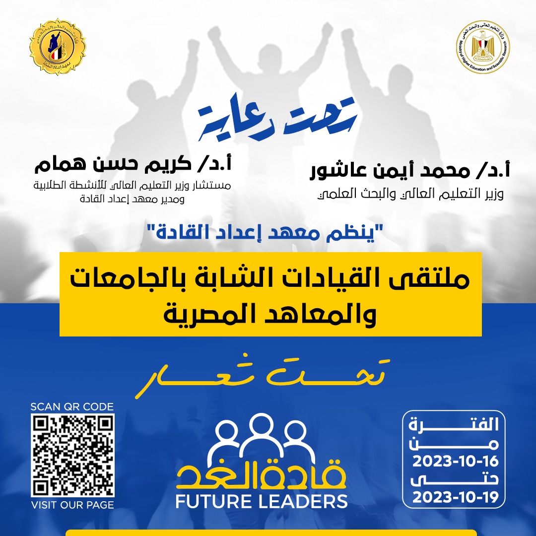 وتعقد فعاليات الملتقى تحت رعاية الدكتور أيمن عاشور وزير التعليم العالي والبحث العلمي، الدكتور كريم همام، مستشار وزير التعليم العالي والبحث العلمي للأنشطة الطلابية، ومدير معهد إعداد القادة، وإشراف الدكتور حسام الدين الشريف وكيل معهد إعداد القادة.
