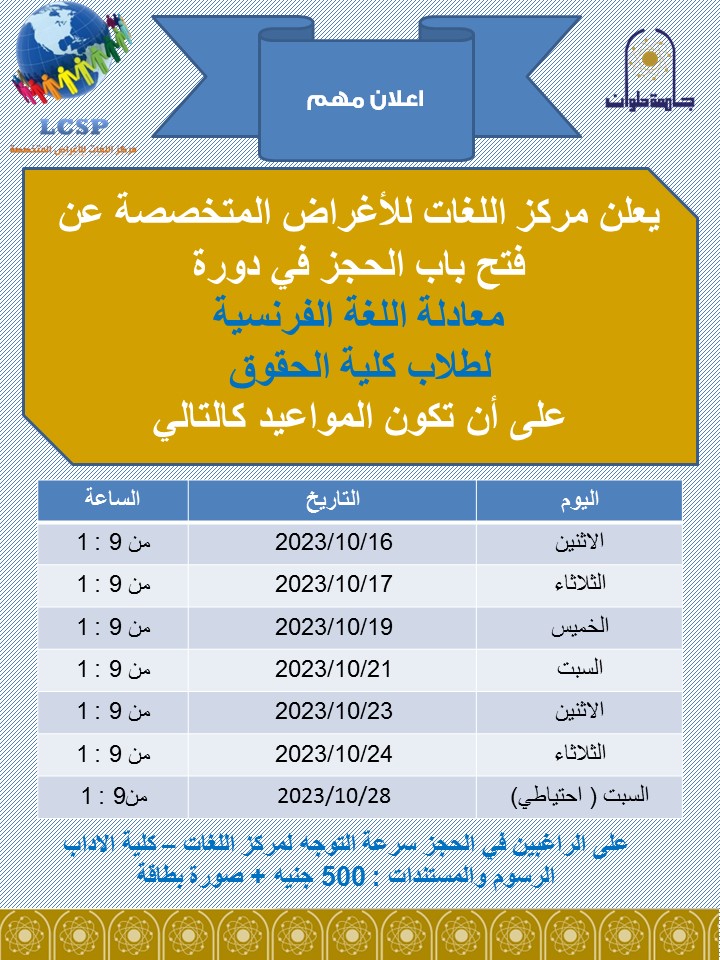 وأوضح الدكتور شادي الكردي مدير مركز اللغات للأغراض المتخصصة بكلية الآداب جامعة حلوان، أنه على الراغبين في الحجز سرعة التوجه لمركز اللغات كلية الآداب وسداد الرسوم والمستندات والمتمثلة في 500 جنيه + صورة بطاقة.