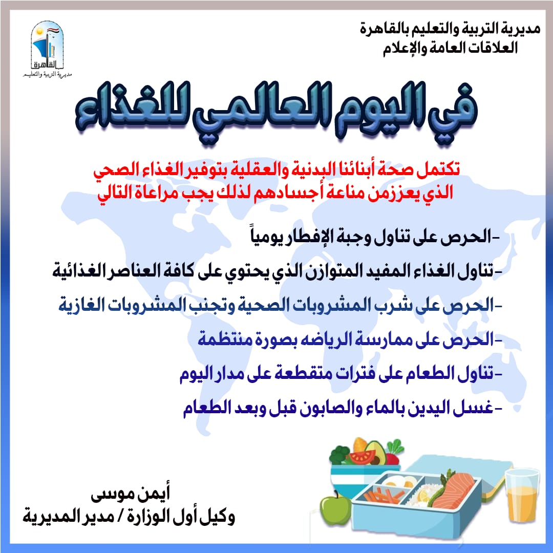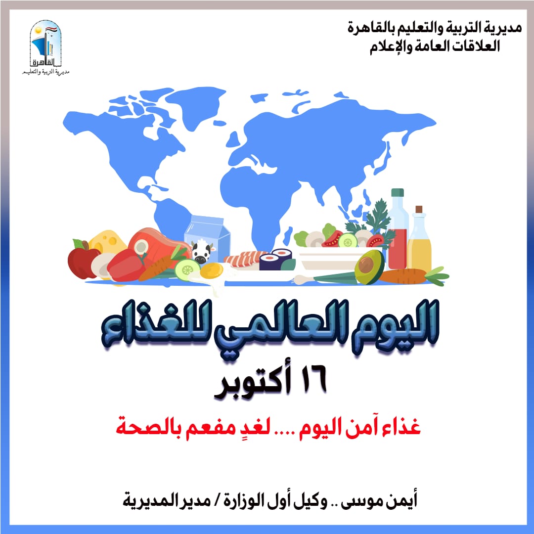 تحتفل مديرية التربية والتعليم بالقاهرة برعاية أيمن موسى وكيل وزارة التربية والتعليم بالقاهرة، باليوم العالمي للغذاء والذى يوافق ١٦ أكتوبر من كل عام.