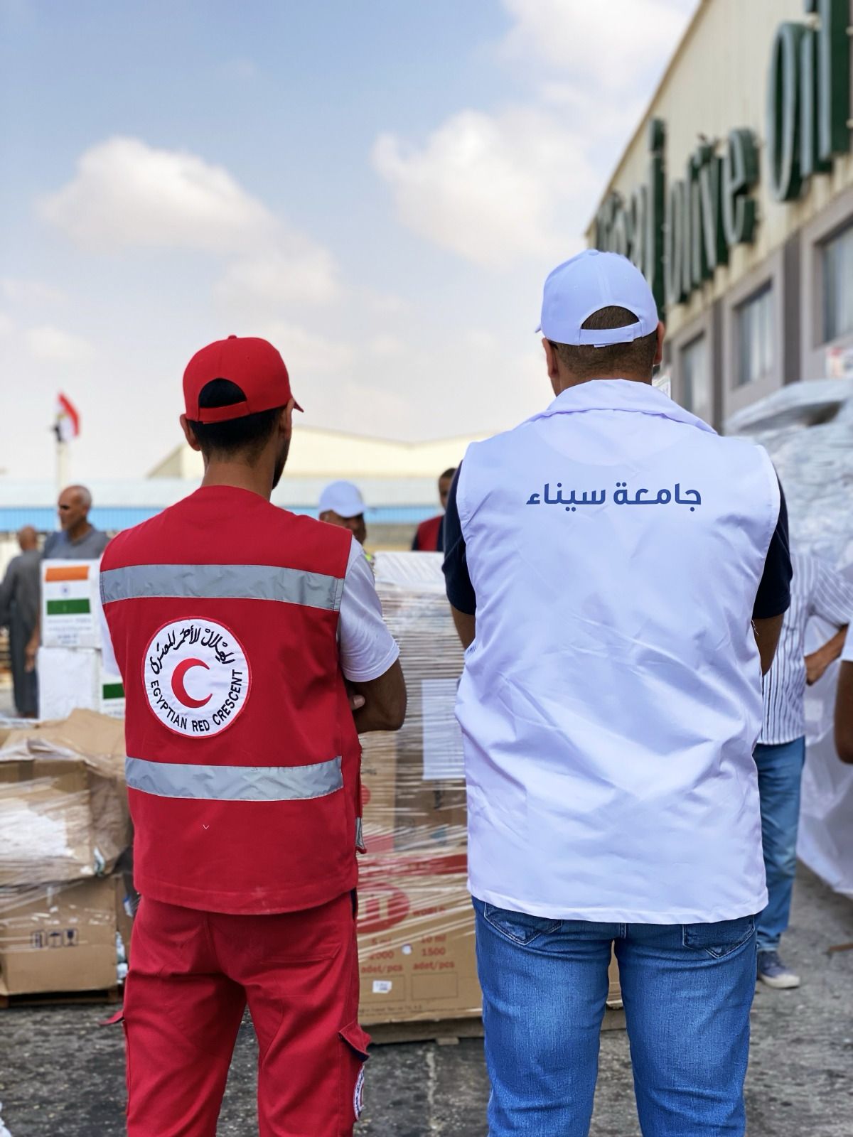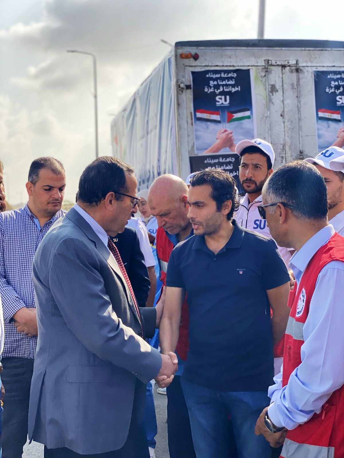 وتوجهت قافلة المساعدات من جامعة سيناء إلى مبنى المحافظة حيث استقبلها المحافظ ومعه عدد من أعضاء مجلس النواب ومسؤولين من الهلال الأحمر وقيادات جامعة سيناء.