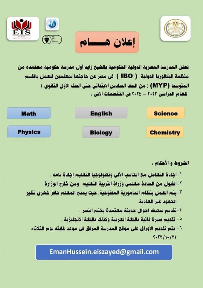 أعلنت المدرسة المصرية الدولية الحكومية بالشيخ زايد أول مدرسة حكومية معتمدة من منظمة البكالوريا الدولية ( IBO ) في مصر عن حاجتها لمعلمين للعمل بالقسم المتوسط (MYP) ( من الصف السادس الابتدائى حتى الصف الأول الثانوى ) للعام الدراسي ۲۰۲۲ - ۲۰۲۴ في التخصصات الآتي: