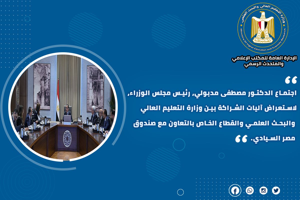 1) عقد الدكتور مصطفى مدبولي، رئيس مجلس الوزراء، اجتماعا؛ لاستعراض آليات الشراكة بين وزارة التعليم العالي والبحث العلمي والقطاع الخاص بالتعاون مع صندوق مصر السيادي، بحضور كل من الدكتورة هالة السعيد وزيرة التخطيط والتنمية الاقتصادية، والدكتور أيمن عاشور وزير التعليم العالي والبحث العلمي، وخلال الاجتماع، تم استعراض عدد من المقترحات الخاصة بالشراكة بين الدولة والقطاع الخاص، والعوائد المتوقعة جراء تنفيذ تلك الشراكات، ووجه رئيس الوزراء بعرض هذه الآليات على اجتماع مجلس الوزراء، لأخذ الموافقة عليها؛ تمهيدا لتنفيذها.