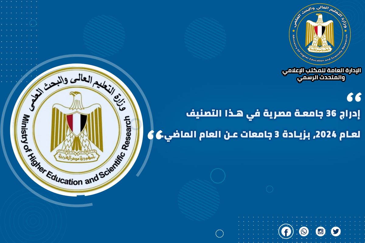 2) أعلن الدكتور أيمن عاشور وزير التعليم العالي والبحث العلمي، ظهور نتائج تصنيف QS العالمي لجامعات الدول العربية، حيث تم إدراج 36 جامعة مصرية في هذا التصنيف لعام 2024، بزيادة 3 جامعات عن العام الماضي، ويشمل التصنيف ترتيب أفضل 223 جامعة على مستوى العالم العربي.