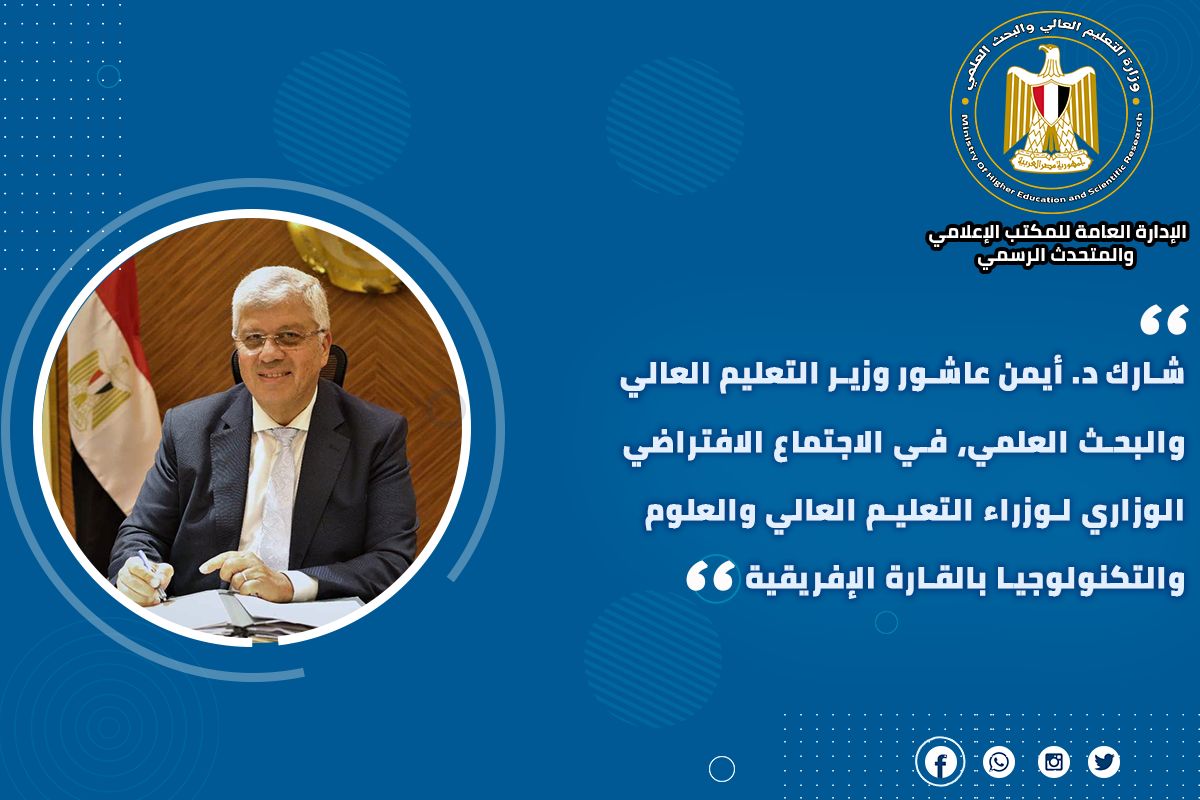 3) شارك الدكتور أيمن عاشور وزير التعليم العالي والبحث العلمي، في الاجتماع الافتراضي الوزاري لوزراء التعليم العالي والعلوم والتكنولوجيا بالقارة الإفريقية، ضمن اجتماع الدورة الاستثنائية الرابعة للجنة الفنية المتخصصة للتعليم والعلوم والتكنولوجيا بالاتحاد الإفريقي، بحضور 35 وزيرًا إفريقيًا للتعليم والعلوم والتكنولوجيا، وممثلين لعدد 35 دولة إفريقية والاتحاد الإفريقي ومنظمة النيباد ومنظمات أخرى.