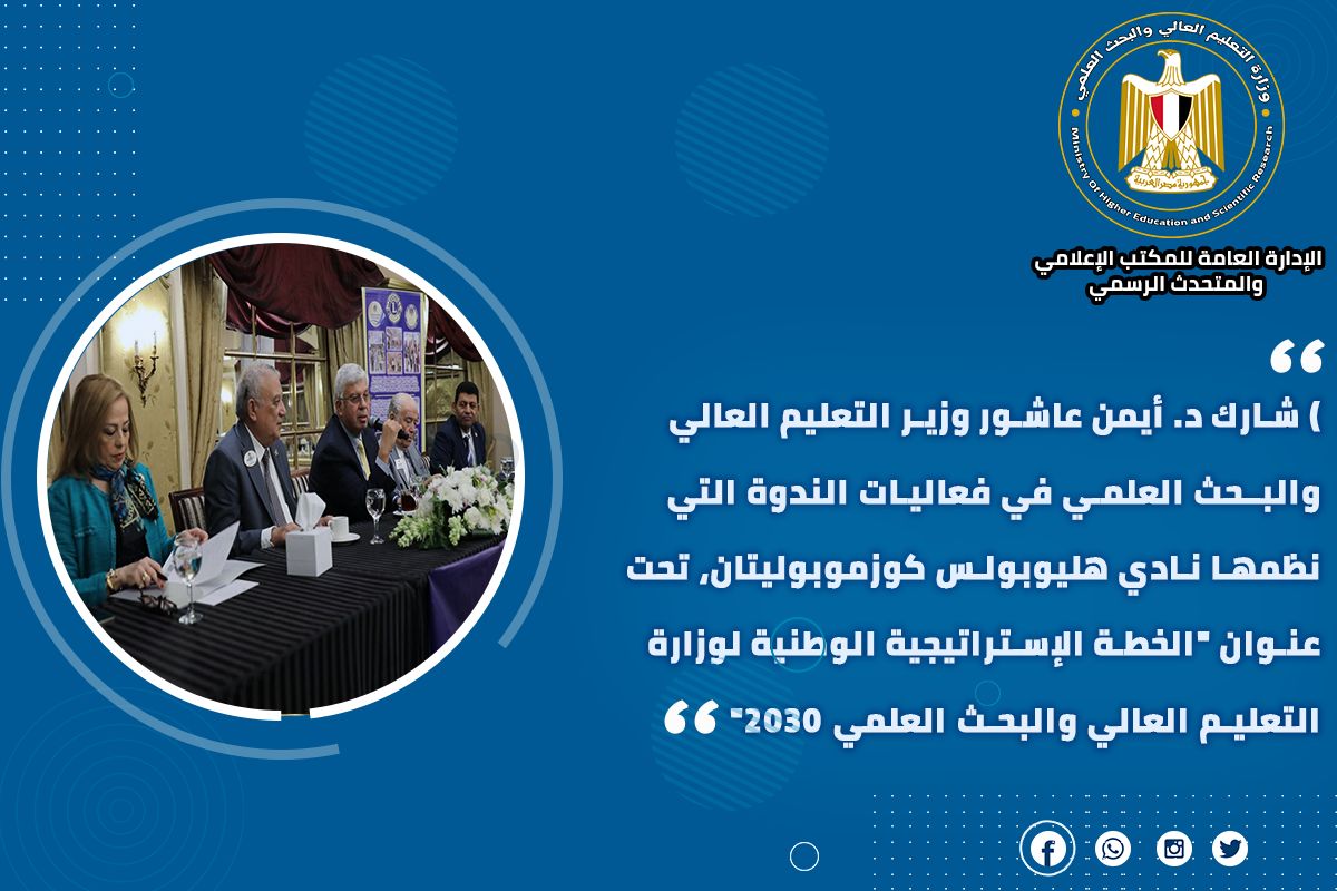 4) شارك الدكتور أيمن عاشور وزير التعليم العالي والبـحث العلمي في فعاليات الندوة التي نظمها نادي هليوبولس كوزموبوليتان، تحت عنوان "الخطة الإستراتيجية الوطنية لوزارة التعليم العالي والبحث العلمي 2030"، وأشار الوزير إلى أن إستراتيجية التعليم العالي تولي اهتمامًا كبيرًا لتأهيل الخريجين وإكسابهم المهارات اللازمة لمتطلبات سوق العمل، ودعم المسار المهني من أجل التوظيف؛ اتساقًا مع جهود الدولة المصرية لتحقيق التنمية المستدامة.
