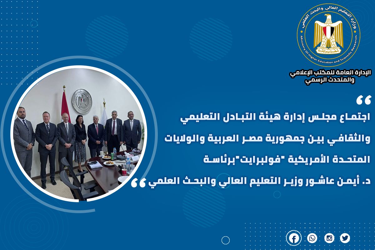 5) عقد مجلس إدارة هيئة التبادل التعليمي والثقافي بين جمهورية مصر العربية والولايات المتحدة الأمريكية "فولبرايت" اجتماعًا برئاسة الدكتور أيمن عاشور وزير التعليم العالي والبحث العلمي، وأكد الوزير أن برنامج فولبرايت في مصر يعُد أحد البرامج الرائدة للتبادل التعليمي والثقافي، مشيرًا إلى أن هذا البرنامج يهدف إلى تعزيز التفاهم المتبادل من خلال تقديم فرص لطلاب الدراسات العليا والأساتذة والمدرسين في مصر، وإجراء الأبحاث العلمية والتدريس وتبادل الأفكار.