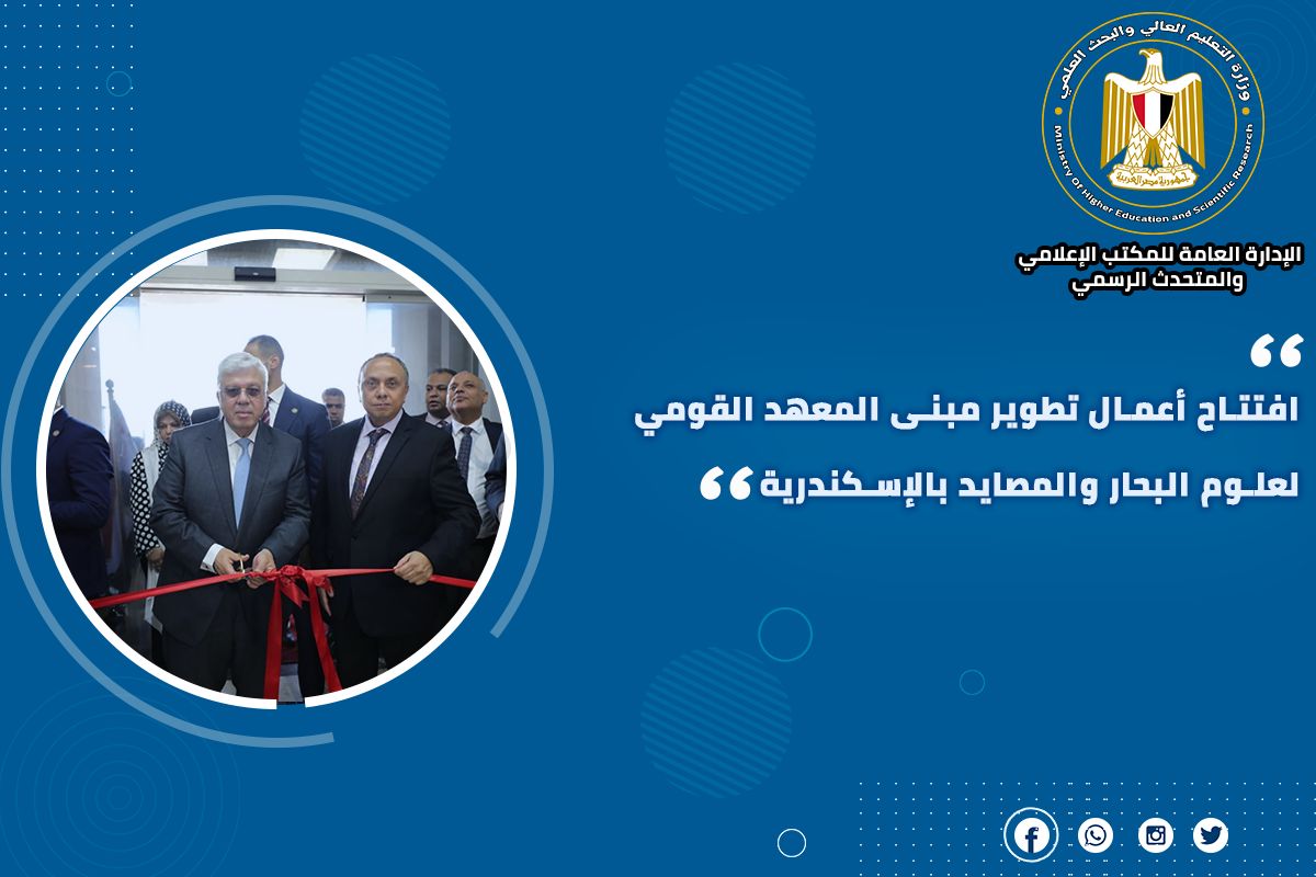 6) افتتح الدكتور أيمن عاشور وزير التعليم العالي والبحث العلمي، أعمال تطوير مبنى المعهد القومي لعلوم البحار والمصايد بالإسكندرية، وأوضح الوزير، أن المعهد يعُد من الصروح العلمية والبحثية المُتميزة، نظرًا لأنه يضم معامل بحثية، وقاعات، وسفن للأبحاث العلمية.