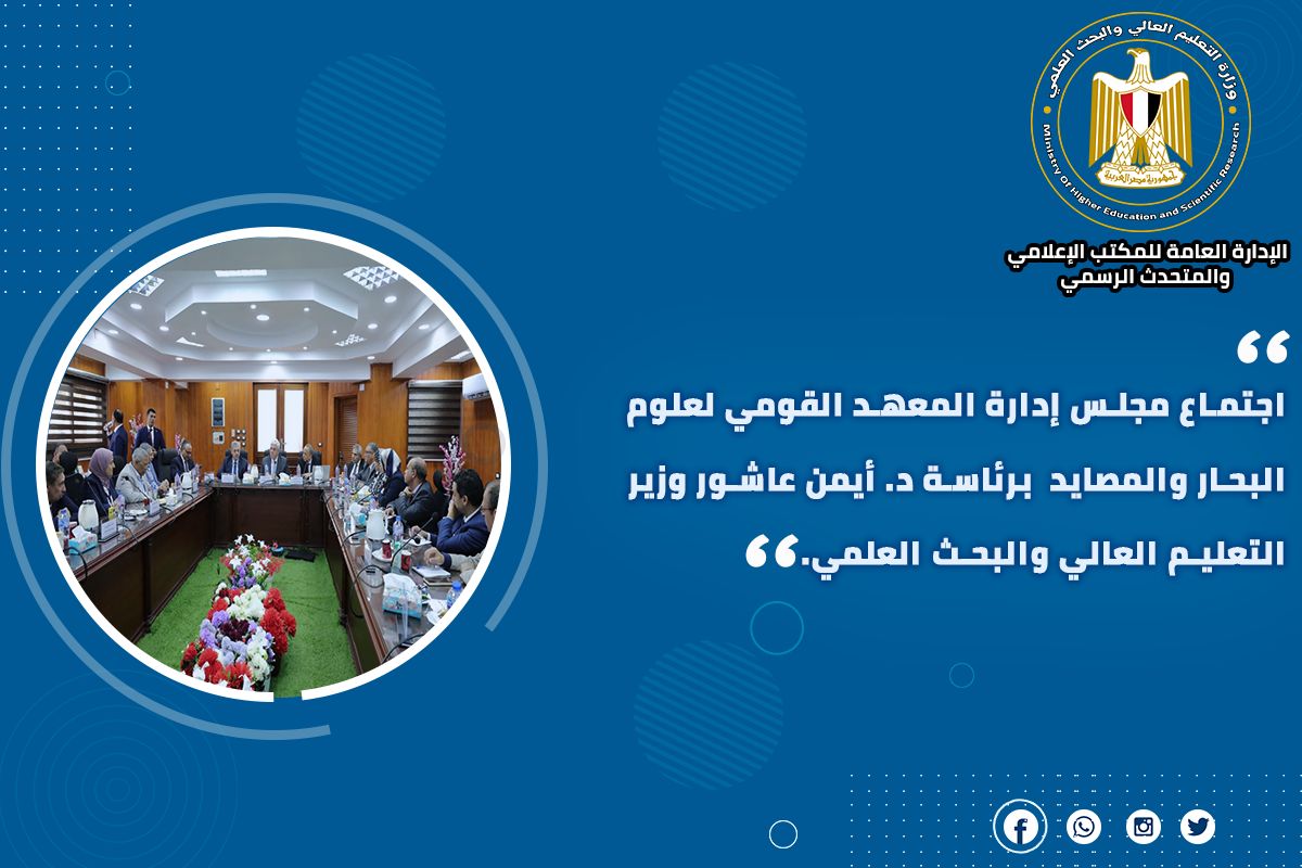 7) عقد مجلس إدارة المعهد القومي لعلوم البحار والمصايد اجتماعًا برئاسة الدكتور أيمن عاشور وزير التعليم العالي والبحث العلمي، وتناول الاجتماع عرض أنشطة المعهد خلال الفترة الماضية، واستعرض المجلس أوجه التعاون على المستوى المحلي، ومنها توقيع بروتوكول تعاون مع مدينة الأبحاث العلمية والتطبيقات التكنولوجية بمدينة برج العرب.